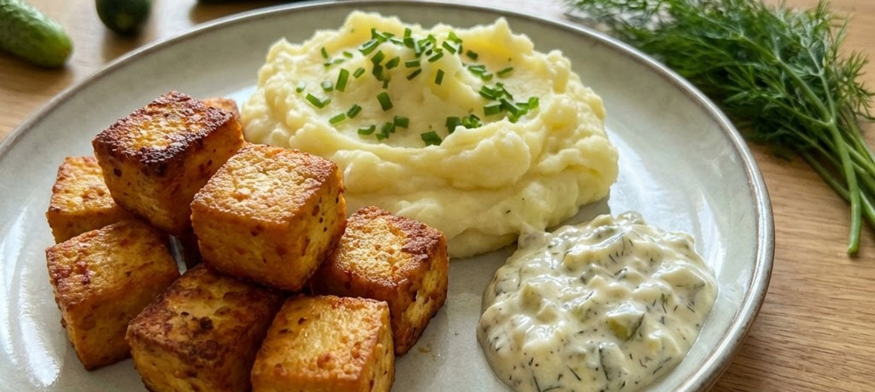 - 3Serviți cubulețele de tofu rumenite alături de piureul de cartofi și sosul tartar rece. Presărați ceapă verde tăiată rondele deasupra pentru un plus de prospețime.