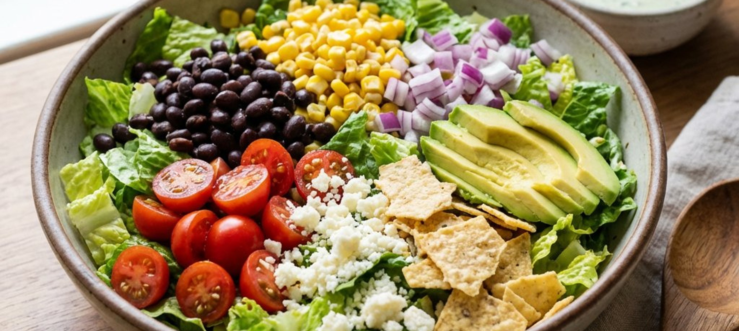 - 1Așezați mixul de salată pe farfurii sau într-un bol mare. Adăugați amestecul de roșii, cubulețele de avocado, porumbul scurs, restul de cheddar ras și dressingul cremos. Finalizați cu chipsurile de tortilla crocante deasupra. Poftă bună!
