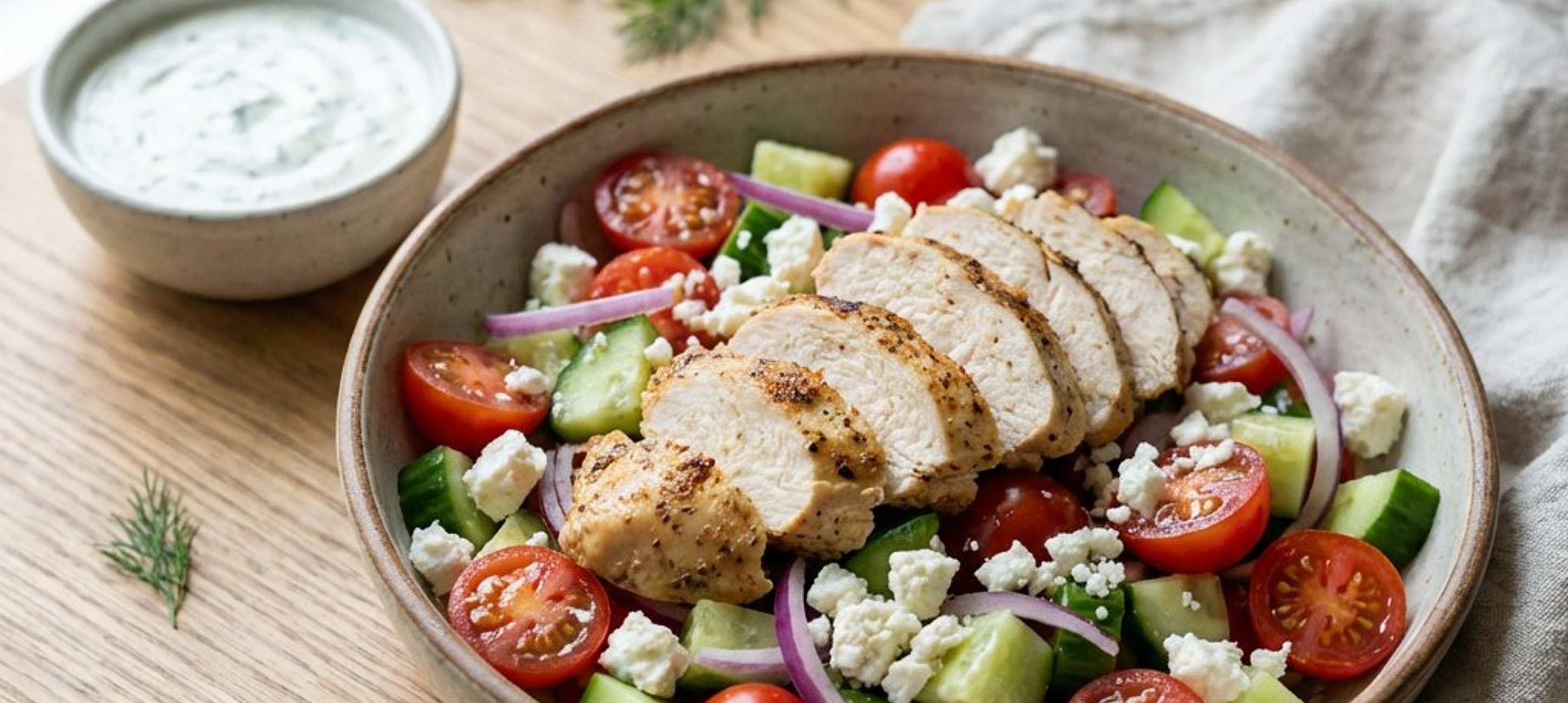 - 3Împărțiți salata în 4 porții și adăugați deasupra feliile de pui cald. Turnați dressingul de iaurt peste fiecare porție și serviți imediat.