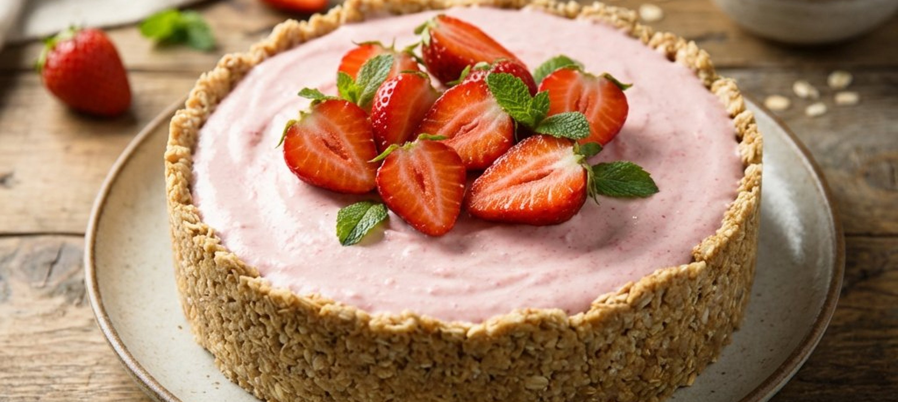 - 2Între timp, pregătiți blatul: într-un bol de mărime medie, amestecați fulgii de ovăz cu untul de arahide și uleiul de cocos lichid. Întindeți amestecul rezultat pe fundul formei de tort și presați-l bine folosind fundul unui pahar. Spălați căpșunile, tăiați-le în jumătăți și așezați-le pe marginea formei, cu partea tăiată spre exterior. Păstrați căpșunile rămase la frigider pentru mai târziu și puneți forma cu blatul la rece.