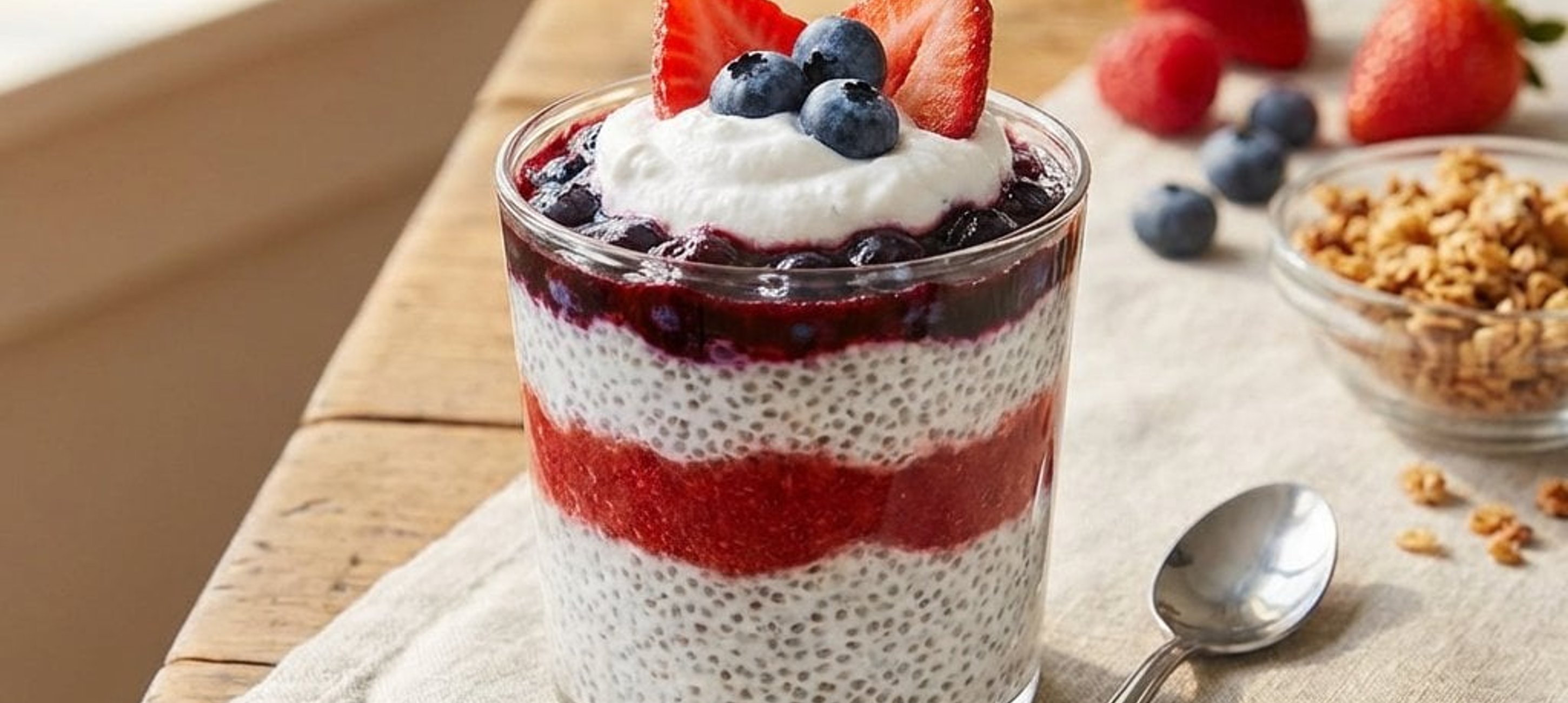 - 1După ce budinca de chia s-a îngroșat, pregătiți 3 pahare (de aproximativ 250 ml fiecare). Repartizați în ele jumătate din cantitatea de budincă de chia, apoi adăugați 250 g de iaurt natur, urmat de o treime din cantitatea de căpșuni și afine.