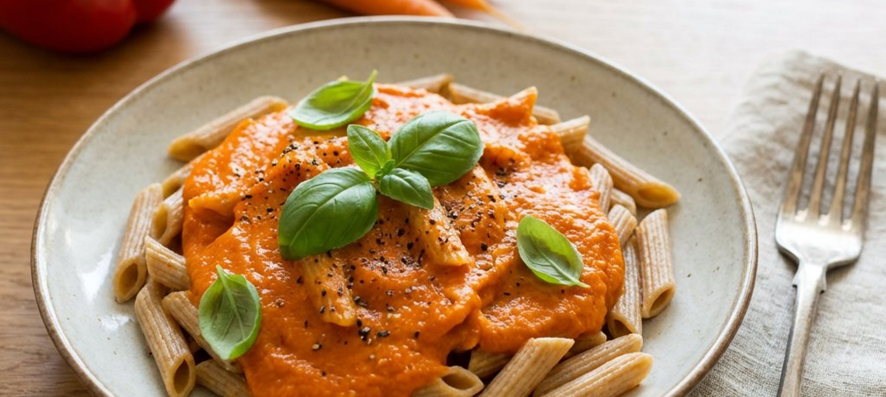 - 2După ce legumele s-au copt, scoateți tava din cuptor. Adăugați peste legume 150 ml de smântână pentru gătit și cei 100 ml de apă păstrați de la paste. Mixați tot conținutul tăvii cu un blender vertical până obțineți un sos fin și omogen. Amestecați pastele fierte direct în sosul obținut.