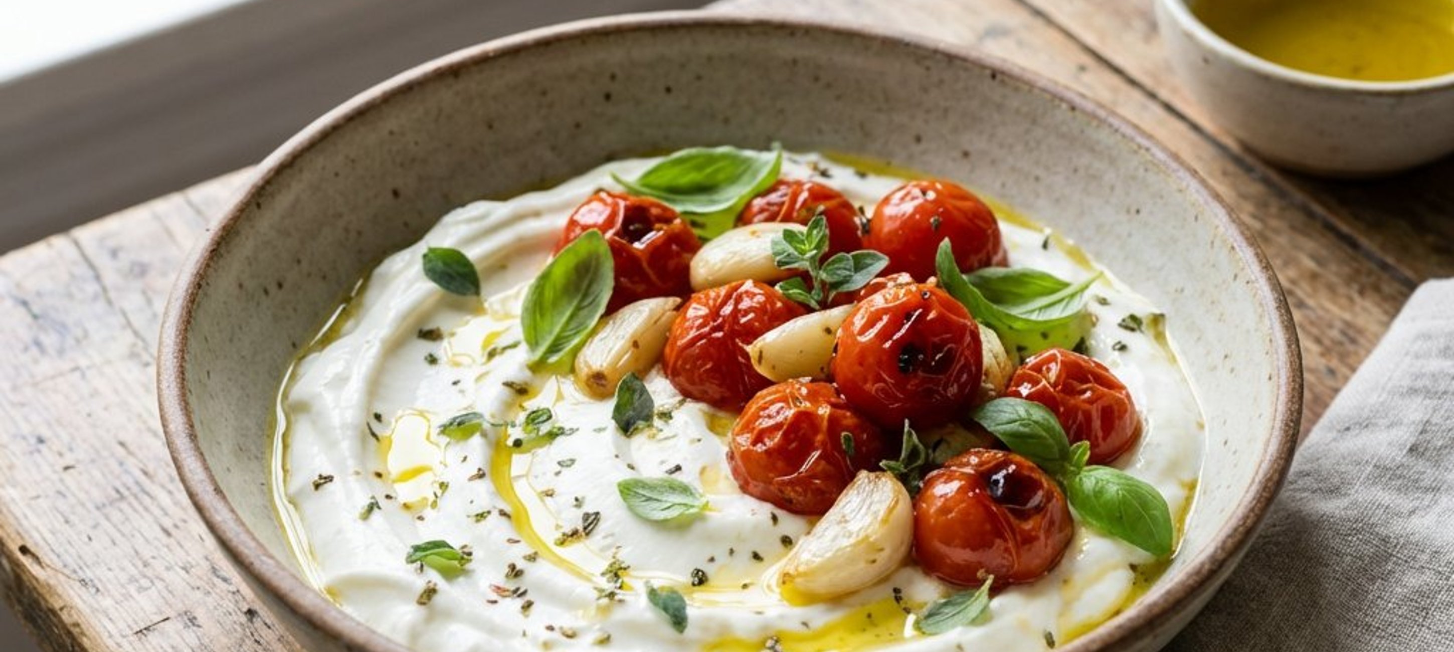 - 1Împărțiți iaurtul grecesc în două boluri. Așezați roșiile coapte deasupra iaurtului. Scoateți usturoiul copt din coajă și adăugați câte 3 căței în fiecare bol. La final, turnați sosul rămas în vasul de copt peste roșii și iaurt.