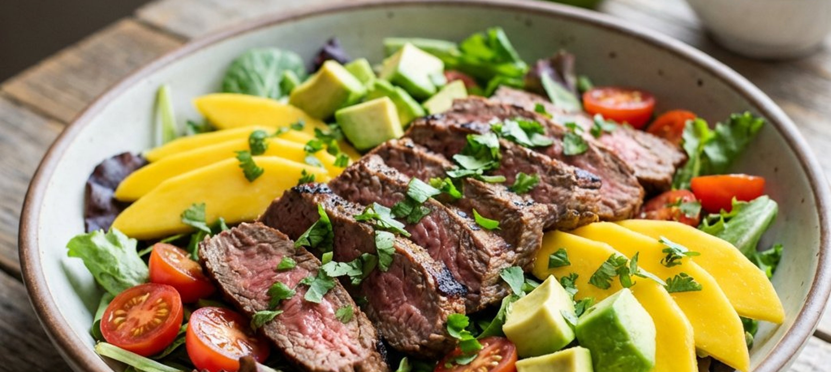 - 3Turnați dressingul peste salată și amestecați ușor. Distribuiți salata pe farfurii și așezați deasupra feliile de friptură de vită la grătar. Serviți imediat.
