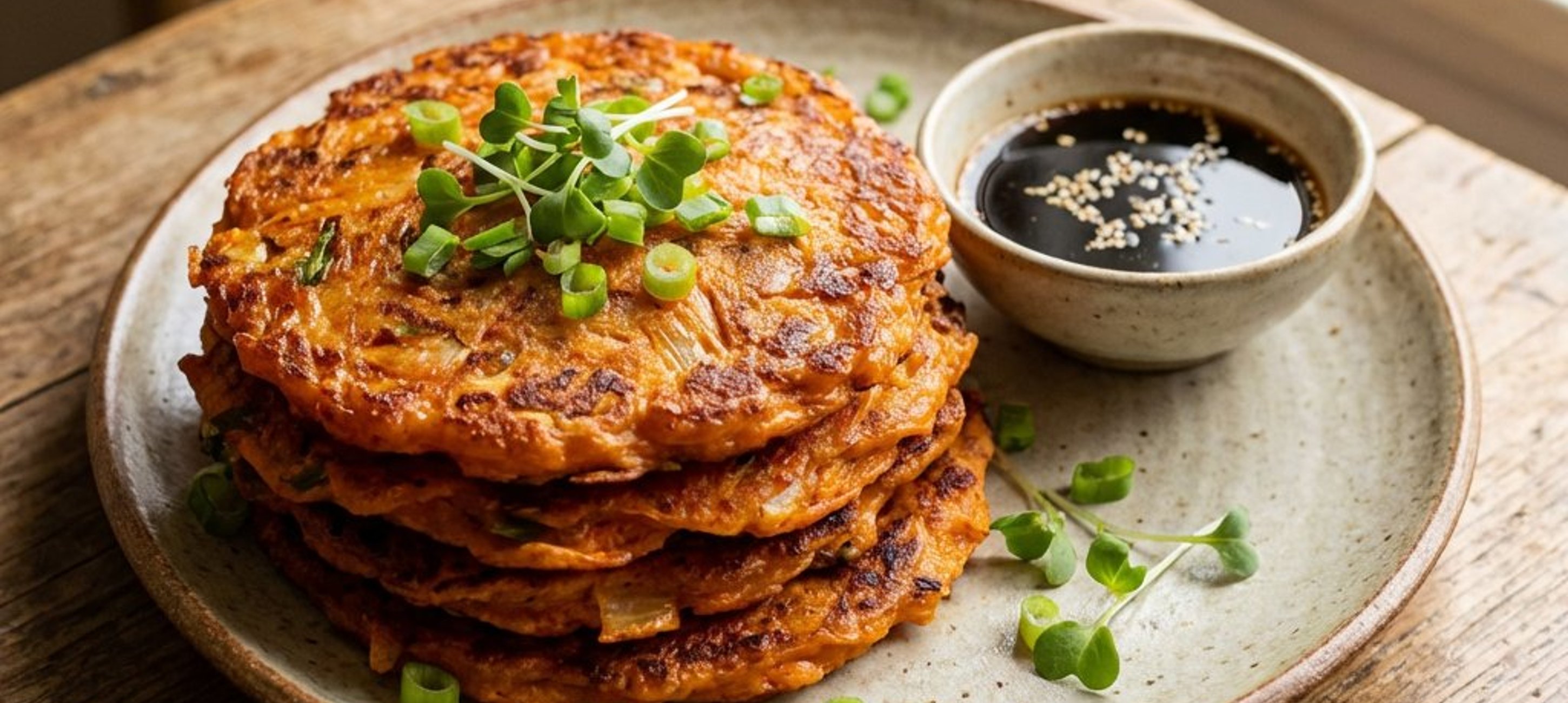 Pentru o textură și mai crocantă, asigurați-vă că apa folosită în aluat este foarte rece, chiar de la gheață! Servirea cu sosul de soia și oțet de orez echilibrează perfect gustul picant al kimchi-ului.