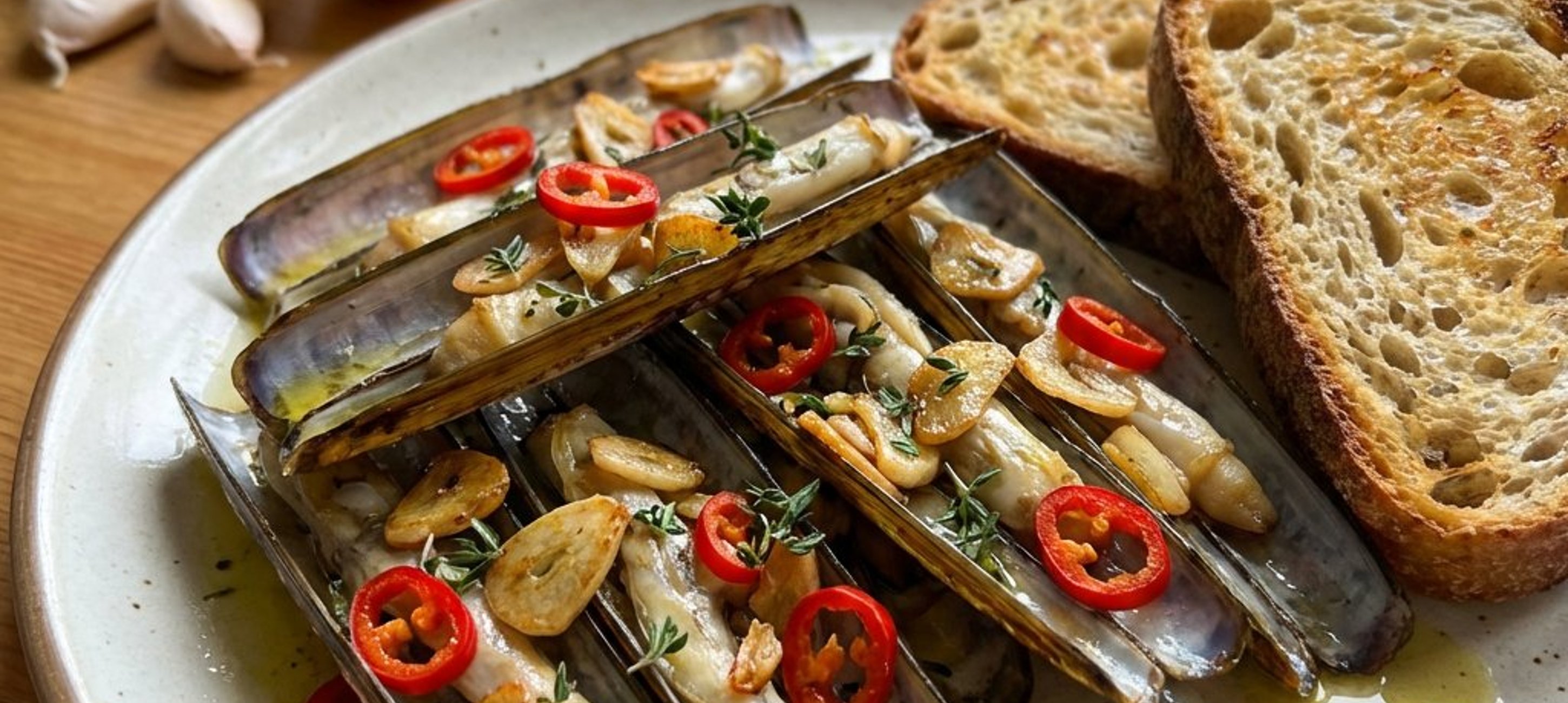 - 3Spălați scoicile brici sub un jet de apă rece. Verificați-le cu atenție: dacă vreo scoică este deschisă și nu se închide la atingere, aruncați-o. Uscați scoicile și așezați-le pe o tavă tapetată cu hârtie de copt. Stropiți-le cu ulei de măsline și presărați deasupra feliile de usturoi și ardei chilli.