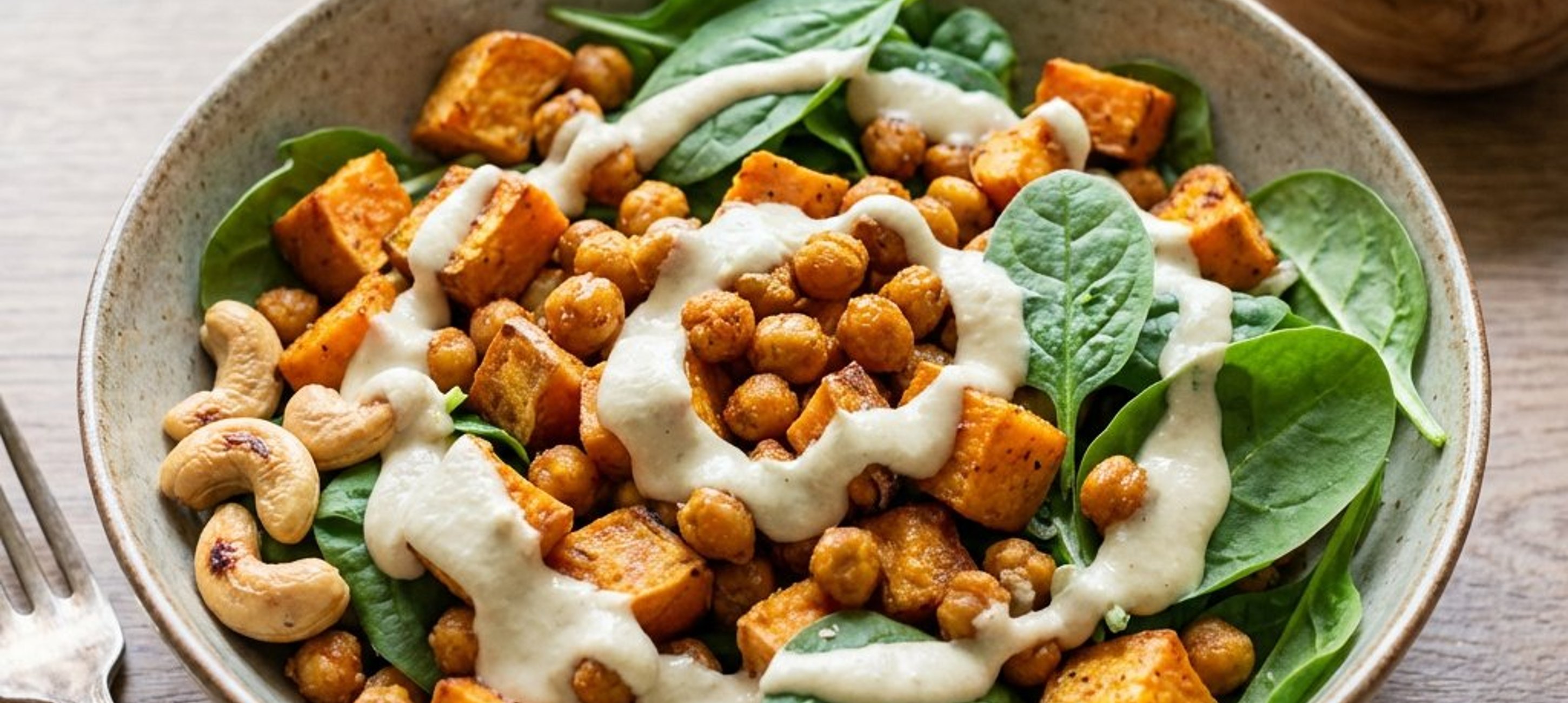 - 2După ce cartofii și năutul s-au copt, scoateți tava din cuptor. Spălați spanacul baby sub un jet de apă rece și puneți-l într-un bol mare. Adăugați legumele coapte peste spanac, turnați dressingul de caju și amestecați ușor. Distribuiți salata în 4 farfurii și serviți imediat.