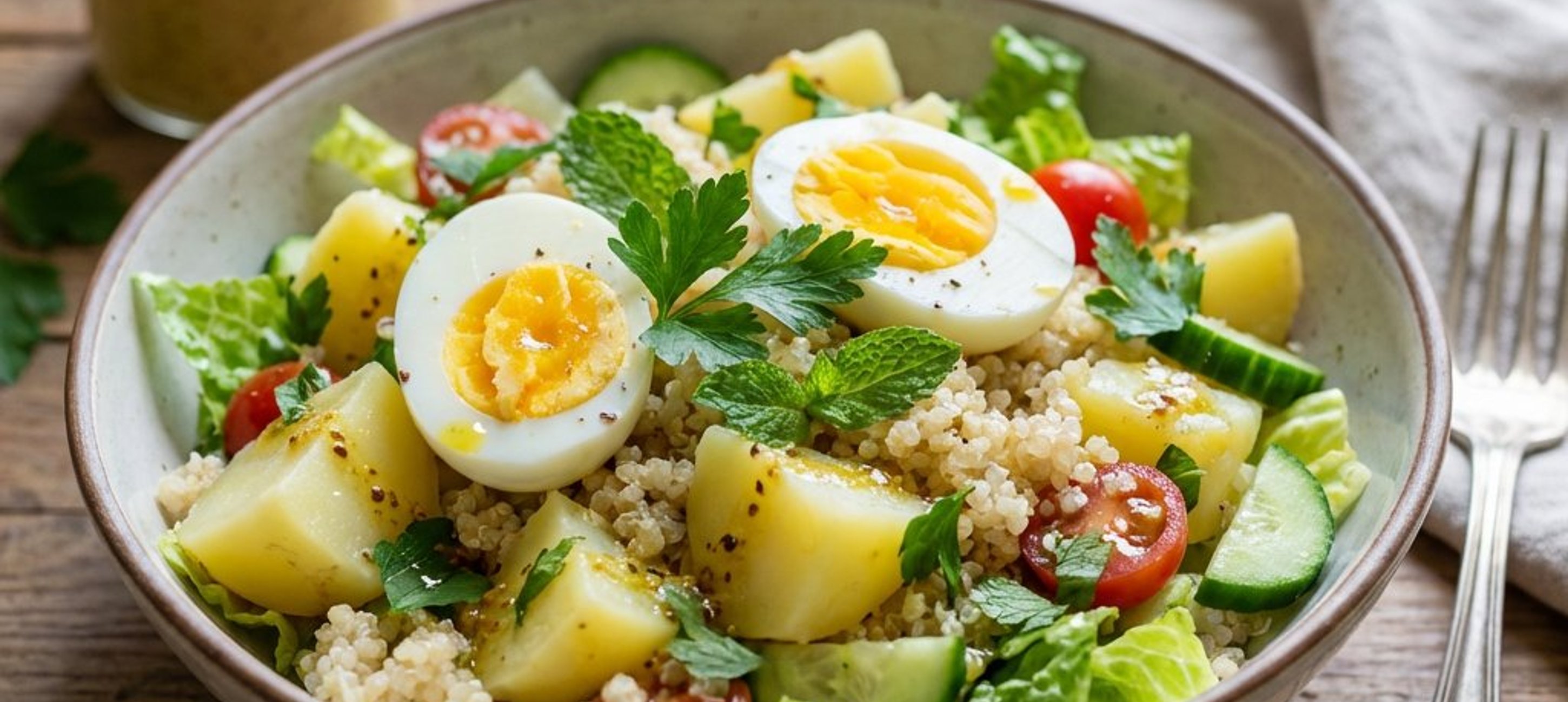 - 3După fierbere, scurgeți cartofii, quinoa și ouăle și răciți-le bine sub jet de apă rece. Curățați ouăle și tăiați-le în sferturi. Tăiați cartofii în cuburi de aproximativ 2,5 cm.
