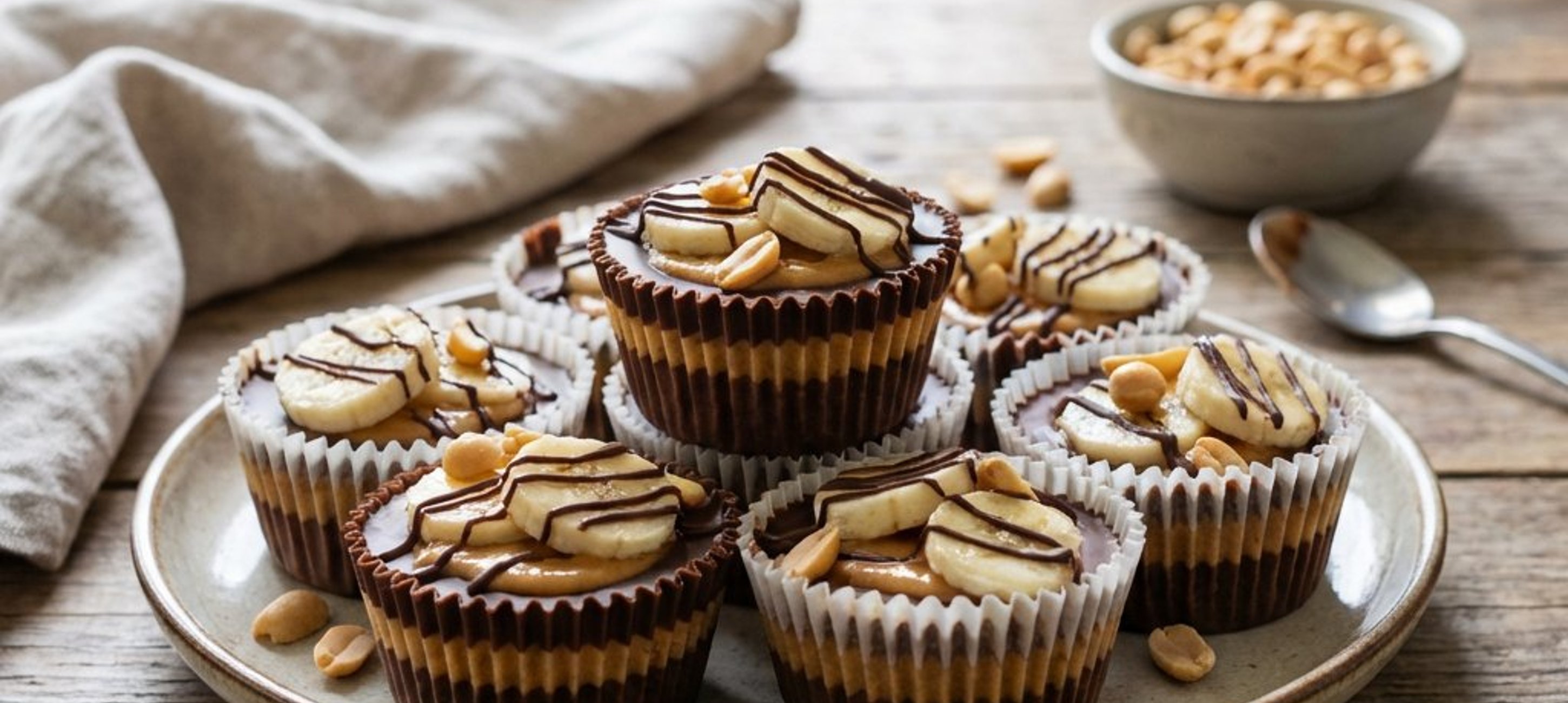 - 2Distribuiți aproximativ 180 g din ciocolata topită în formele de brioșe, apoi adăugați în fiecare câte o felie de banană și o porție de unt de arahide. Puneți forma la congelator pentru 5-10 minute.