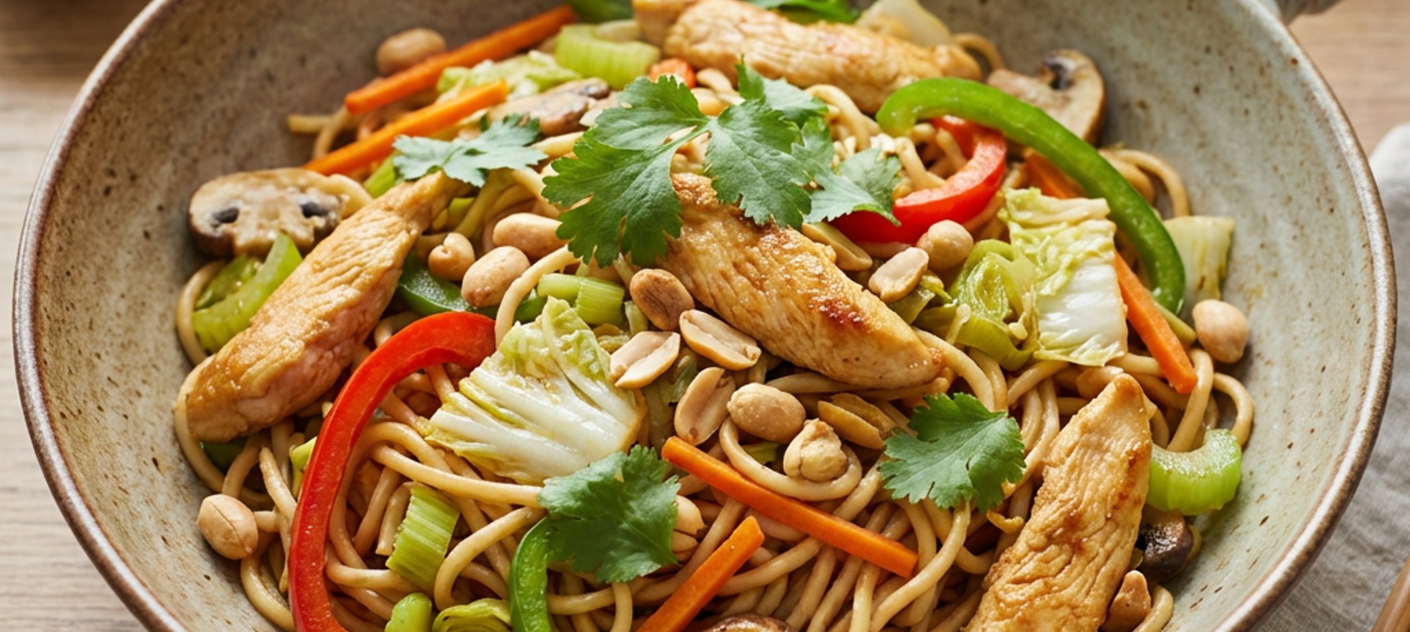 - 6Amestecați și distribuiți tăițeii pe toată suprafața tigăii. Amestecați din nou și adăugați varza. Omogenizați bine, luați de pe foc și mai amestecați timp de 1 minut. Încorporați frunzele de coriandru. Serviți presărat cu alunele prăjite.