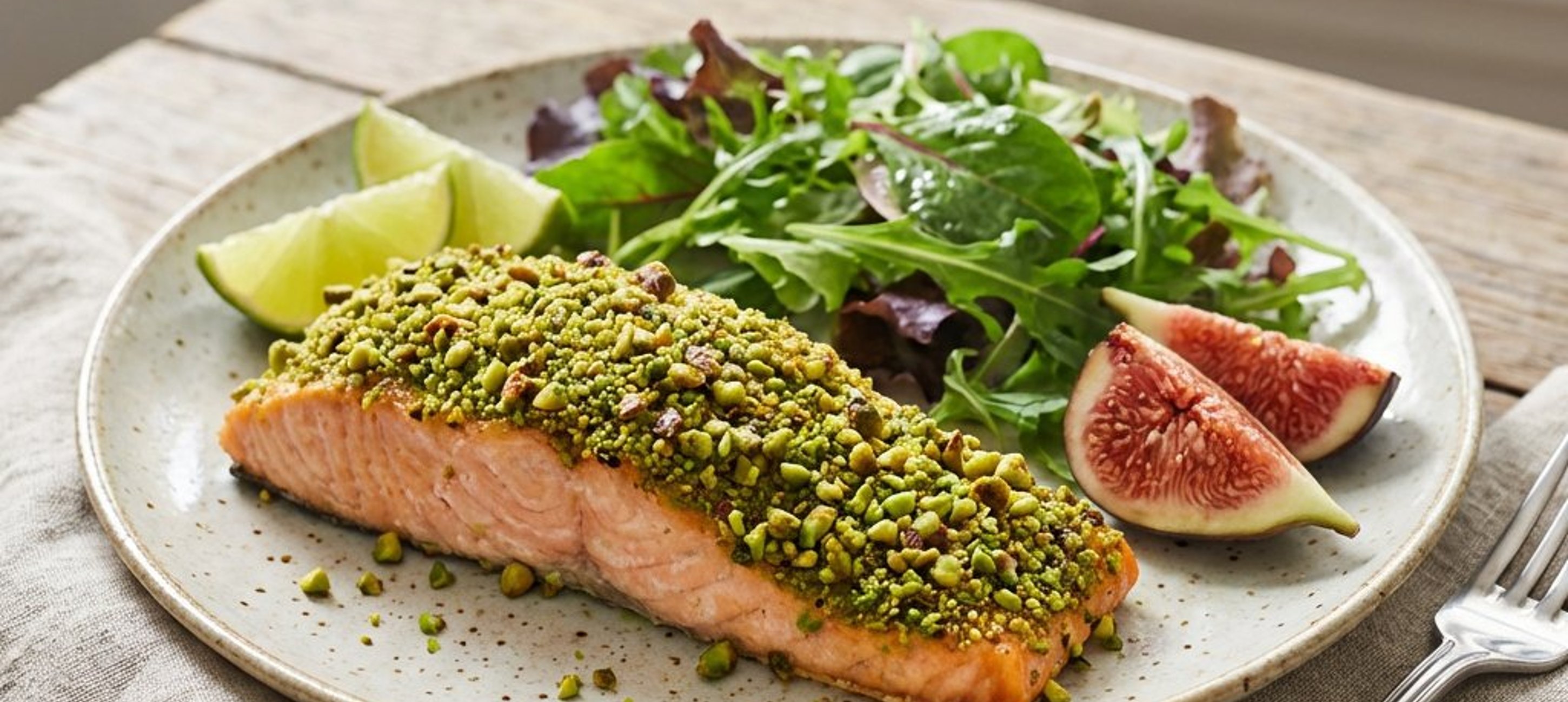 - 2În timp ce peștele se coace, pregătiți salata: amestecați mixul de frunze verzi cu restul de ulei de măsline și puțin suc de lime. Tăiați fructele (smochine sau piersici) în sferturi și ardeiul iute (dacă folosiți) în rondele fine.