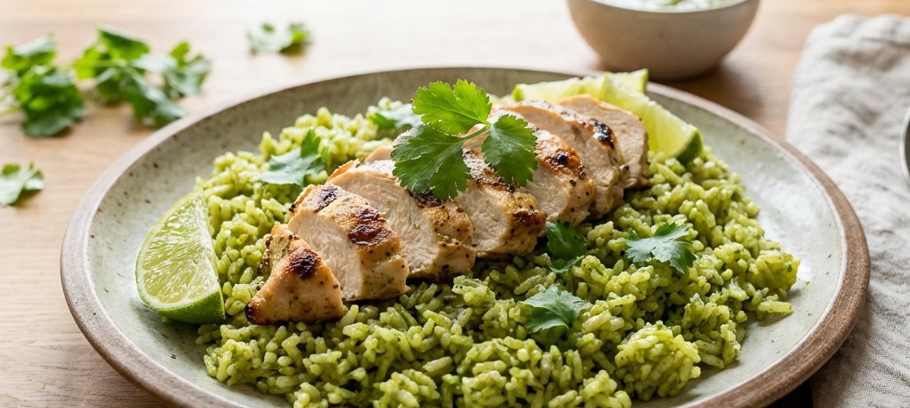 - 2După ce puiul este gata, scoateți-l din cuptor și tăiați-l în felii subțiri. Împărțiți orezul verde în 4 porții, așezați deasupra feliile de pui și serviți imediat.