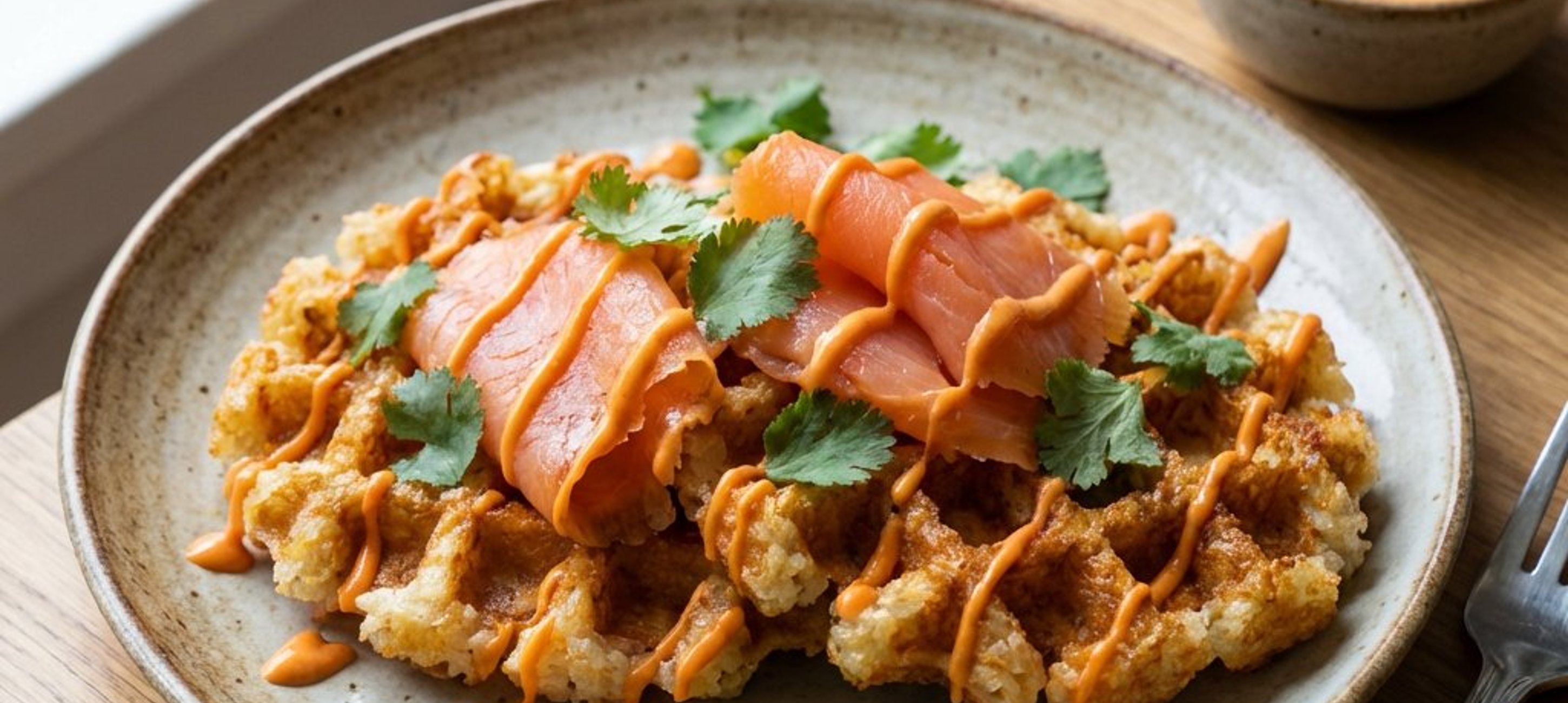 - 2Așezați waffle-urile pe farfurii și distribuiți uniform amestecul de somon deasupra fiecarei porții. Serviți imediat.