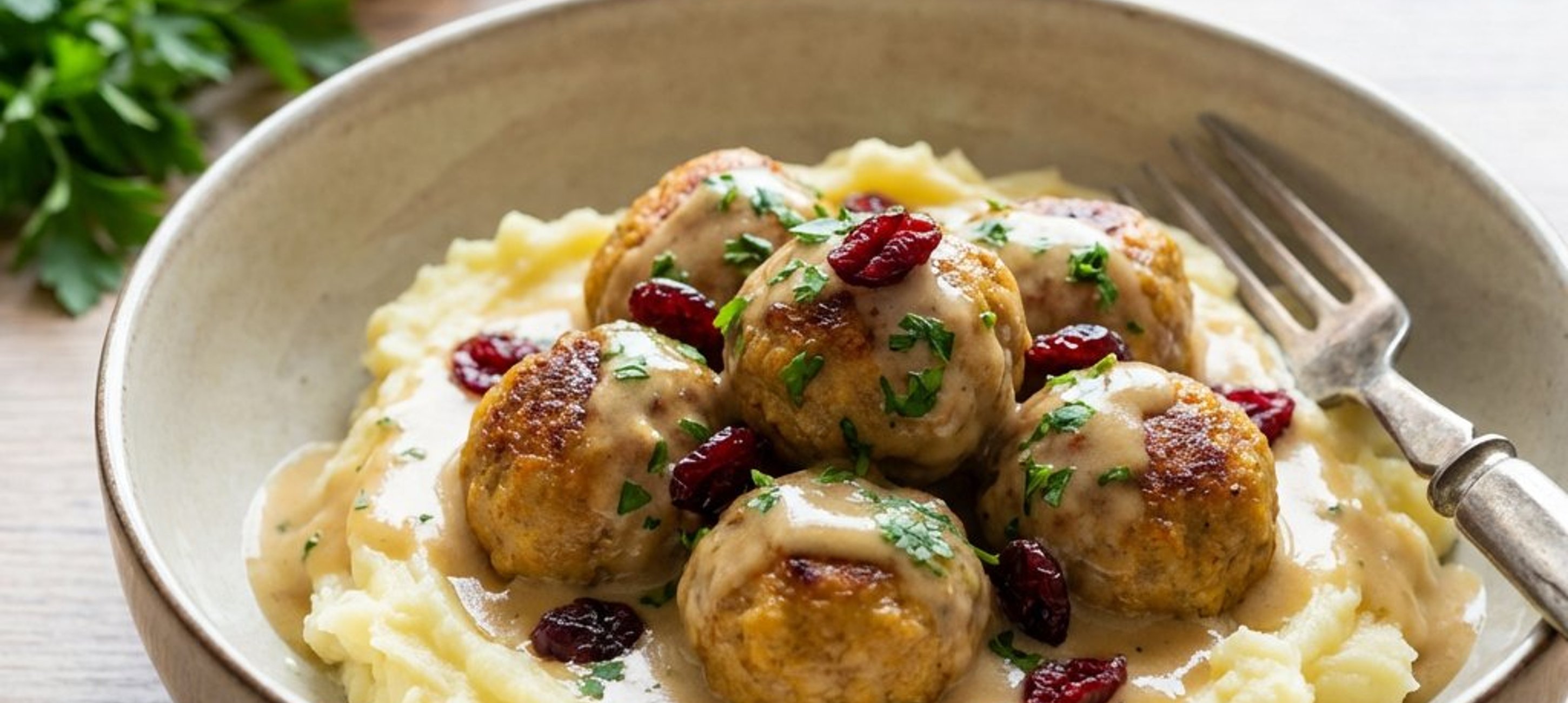 - 2Distribuiți piureul de cartofi, chifteluțele și sosul pe 4 farfurii. Presărați deasupra merișoarele uscate și pătrunjelul verde tocat fin. Serviți imediat.