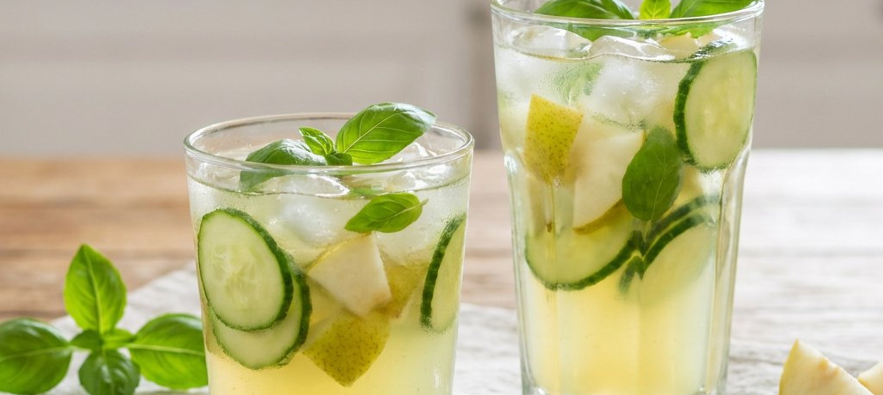 - 2În două pahare mari (aprox. 400 ml), puneți o cantitate generoasă de gheață. Adăugați feliile de castravete, cubulețele de pară, siropul de pere și frunzele de busuioc.