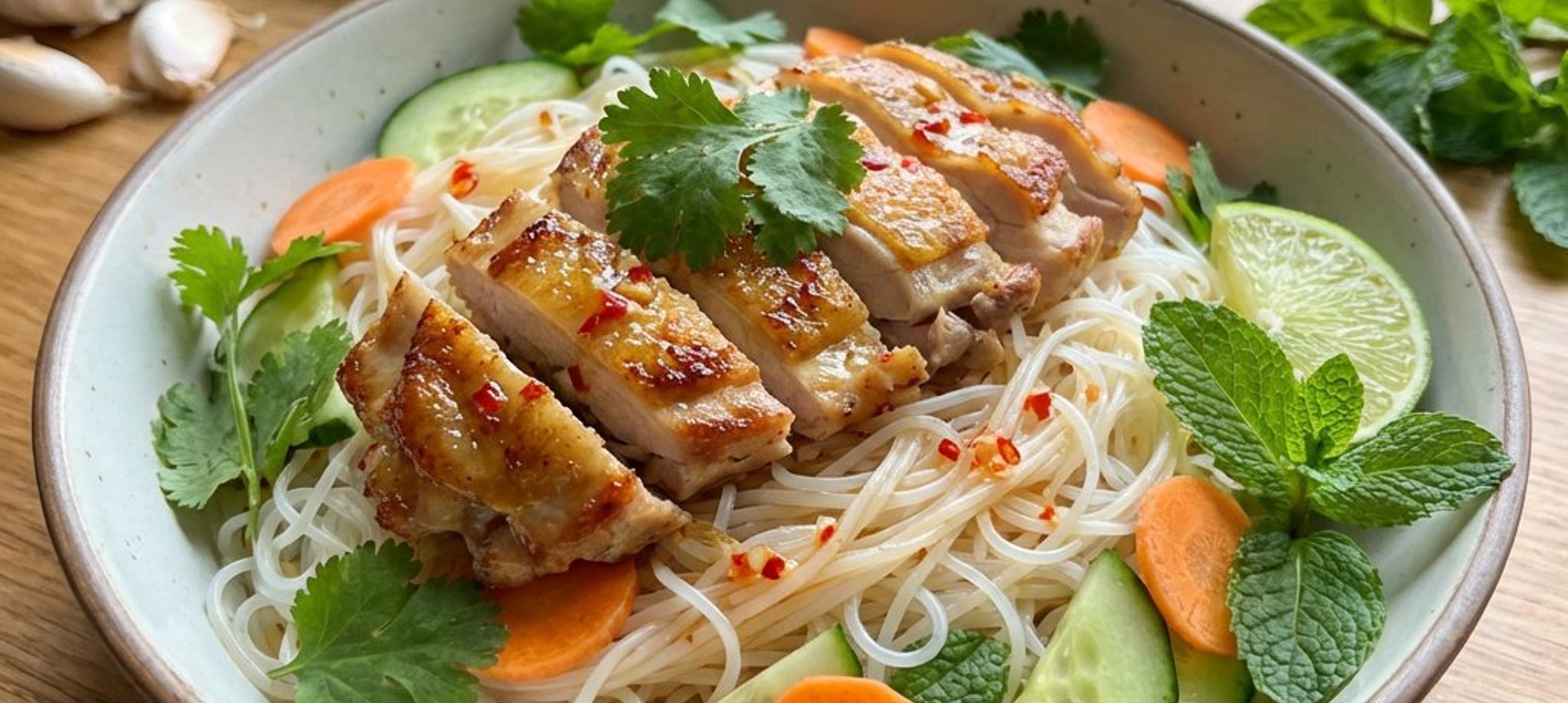 - 2Asamblați salata: împărțiți tăiețeii de orez în două boluri. Deasupra fiecărei porții, așezați castravetele, morcovul, salata romană, coriandrul, menta și fâșiile de pui. La final, turnați dressingul pregătit peste fiecare porție și serviți imediat.