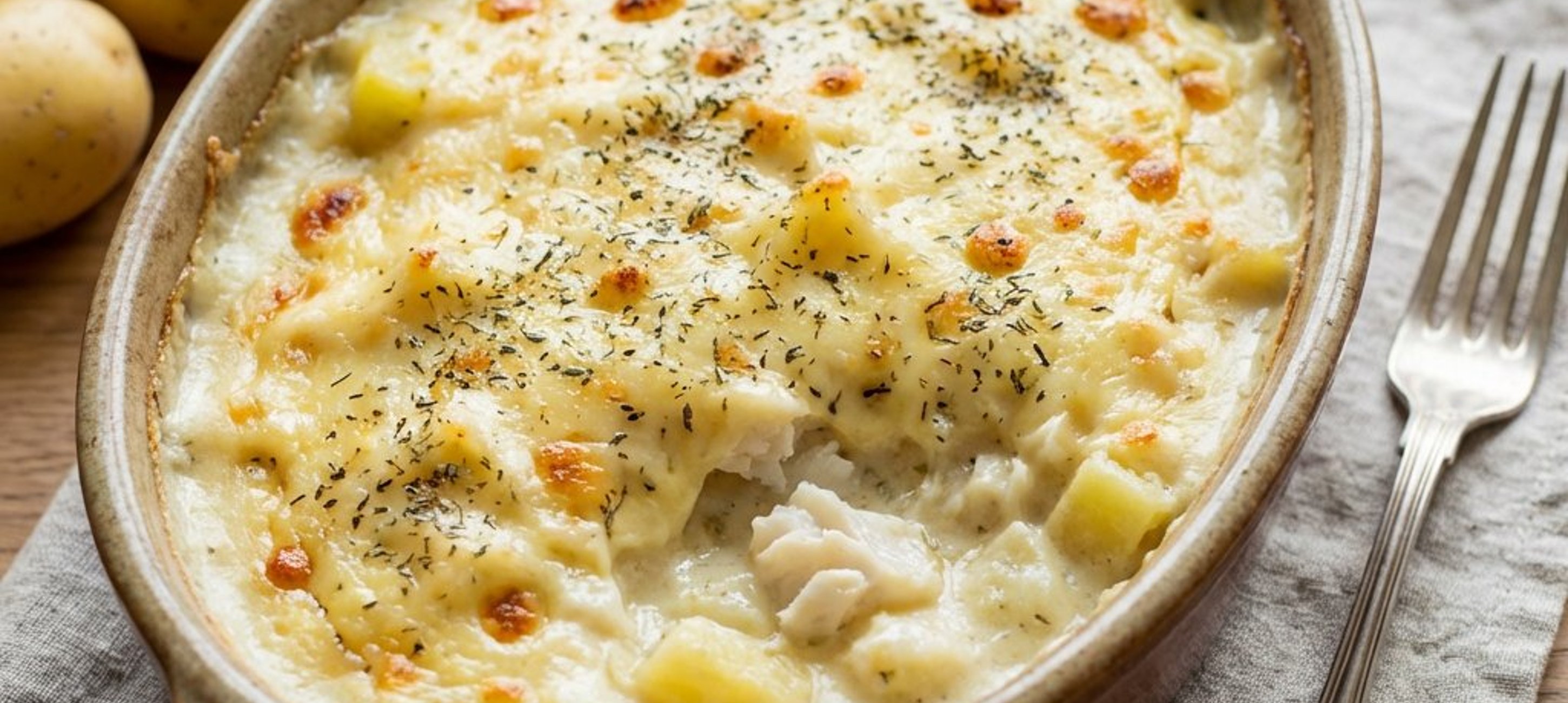 - 3Preîncălziți cuptorul la 200 °C și pregătiți un vas termorezistent (aproximativ 23 cm x 27 cm). După ce cartofii și codul s-au fiert, scurgeți-i bine și adăugați-i în tigaia cu sosul pregătit. Zdrobiți totul ușor cu o furculiță până obțineți o compoziție omogenă, dar cu textură. Transferați amestecul în vasul termorezistent. Radeți brânza Edam pe răzătoarea mică și presărați-o deasupra. Introduceți vasul în cuptorul preîncălzit și coaceți timp de 20-25 de minute, până când brânza devine aurie și crocantă.