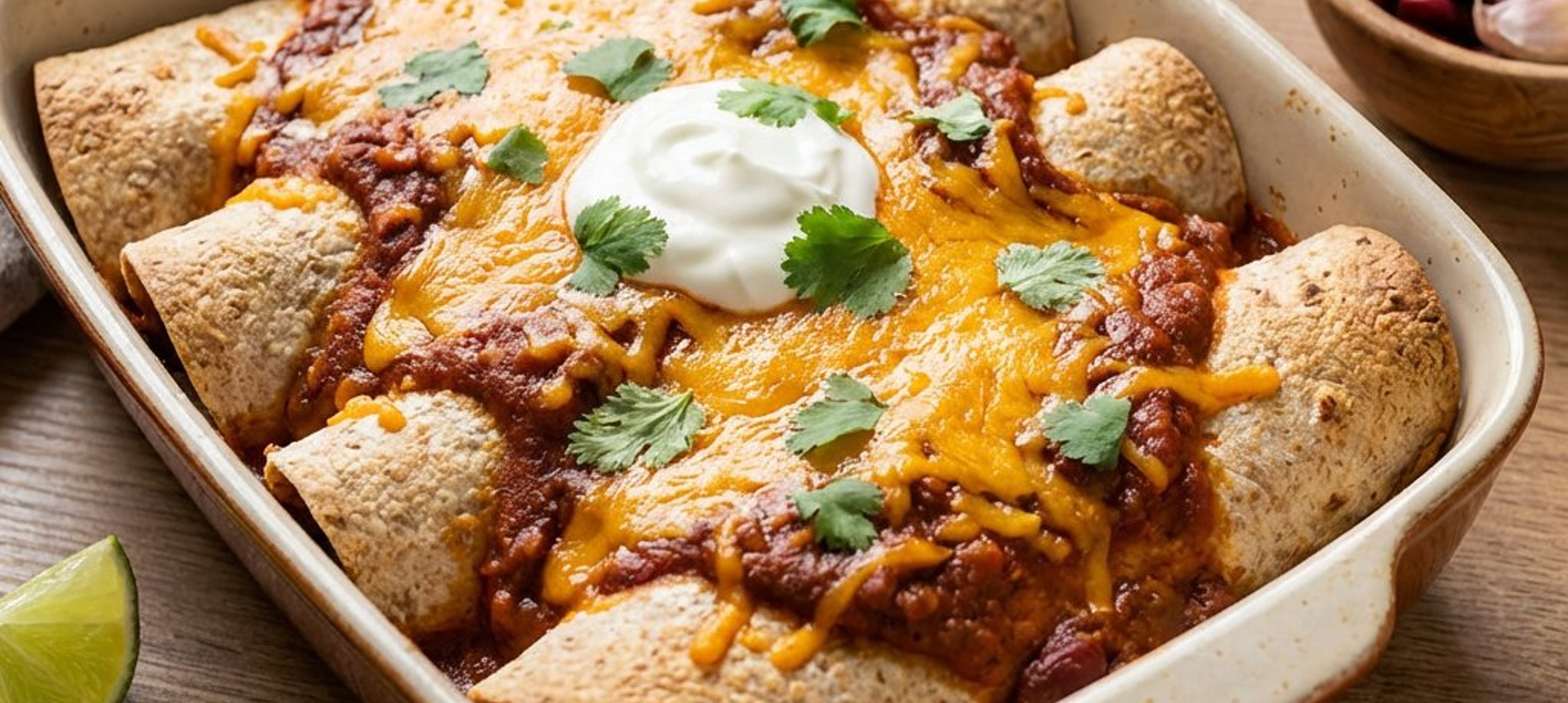 Pentru un plus de prospețime, servește enchiladas cu o lingură de smântână grasă și câteva felii de avocado.