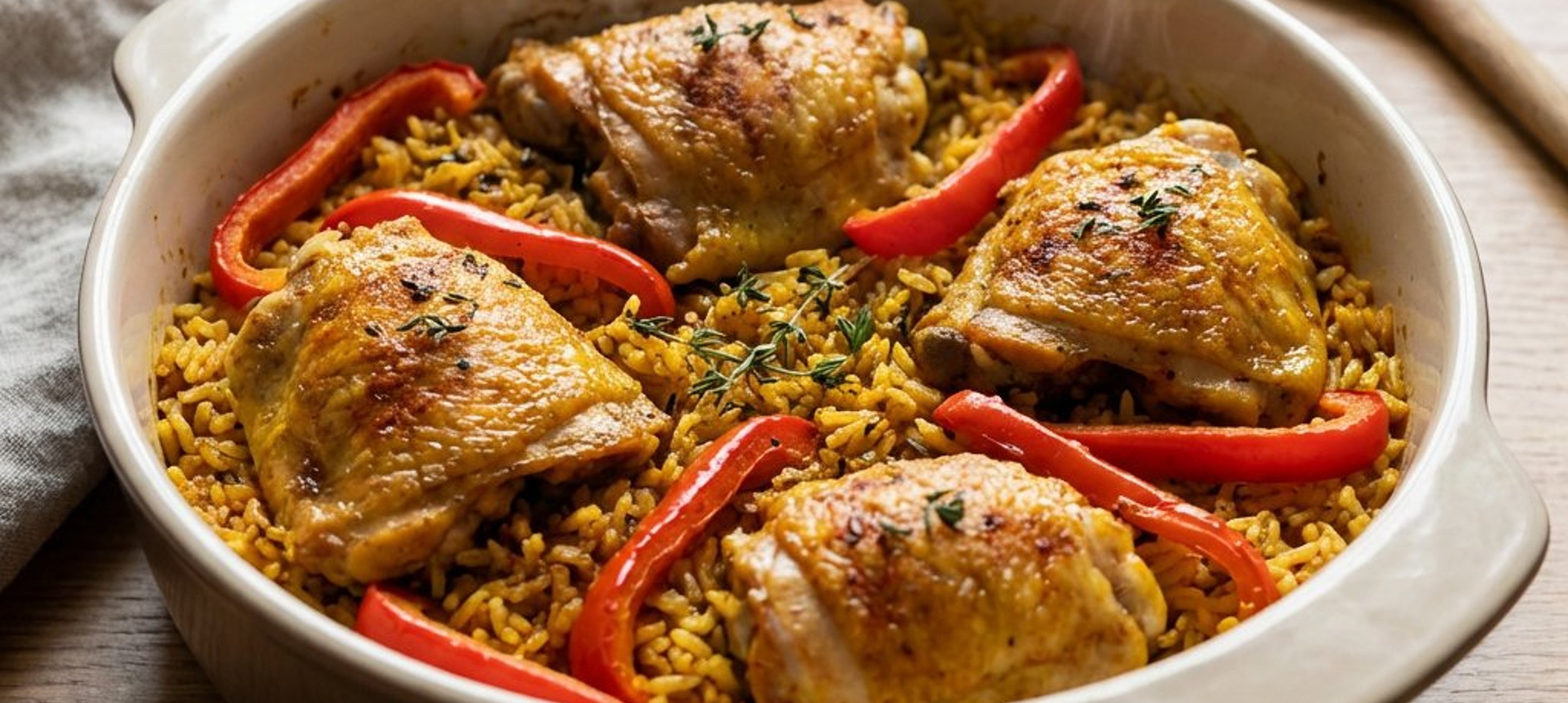 - 1Preîncălziți cuptorul la 180 °C și pregătiți o tavă de copt (aprox. 23 cm × 27 cm). Puneți orezul în tavă și adăugați pudra de curry, cimbrul uscat, ardeiul tăiat, ceapa, usturoiul zdrobit, 2 linguri de ulei de măsline, sarea și piperul. Turnați supa de pui deasupra și amestecați bine. Așezați bucățile de pui deasupra amestecului, apoi condimentați-le cu sare și piper.
