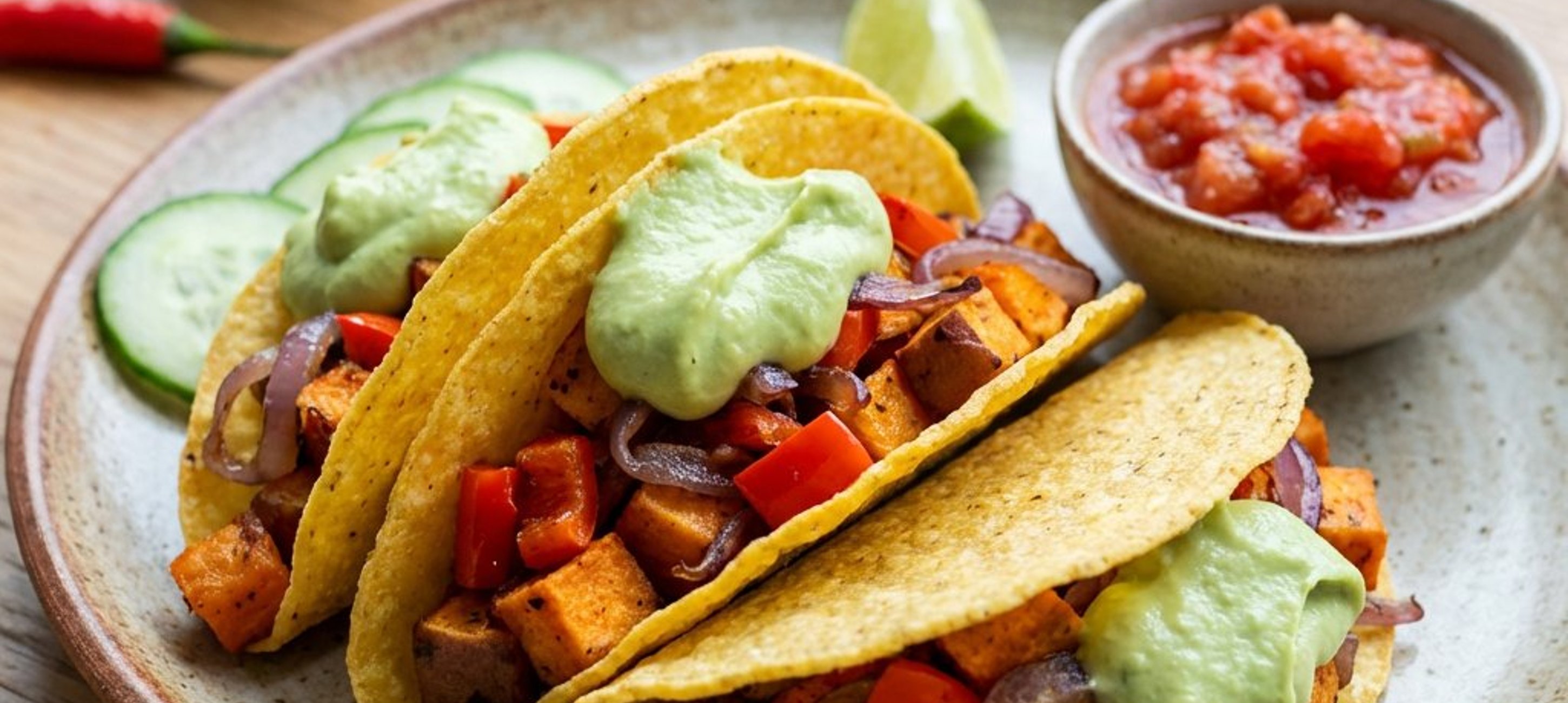 - 3Pregătiți spuma de avocado: tăiați avocado în jumătate, scoateți sâmburii și scobiți miezul într-un bol. Zdrobiți-l bine cu o furculiță, apoi încorporați iaurtul grecesc și al doilea cățel de usturoi zdrobit. Omogenizați și potriviți de sare și piper. Între timp, încălziți formele de taco în cuptor timp de aproximativ 5 minute. Umpleți fiecare taco cu amestecul de cartofi dulci, adăugați spuma de avocado și feliile de castravete. Poftă bună!