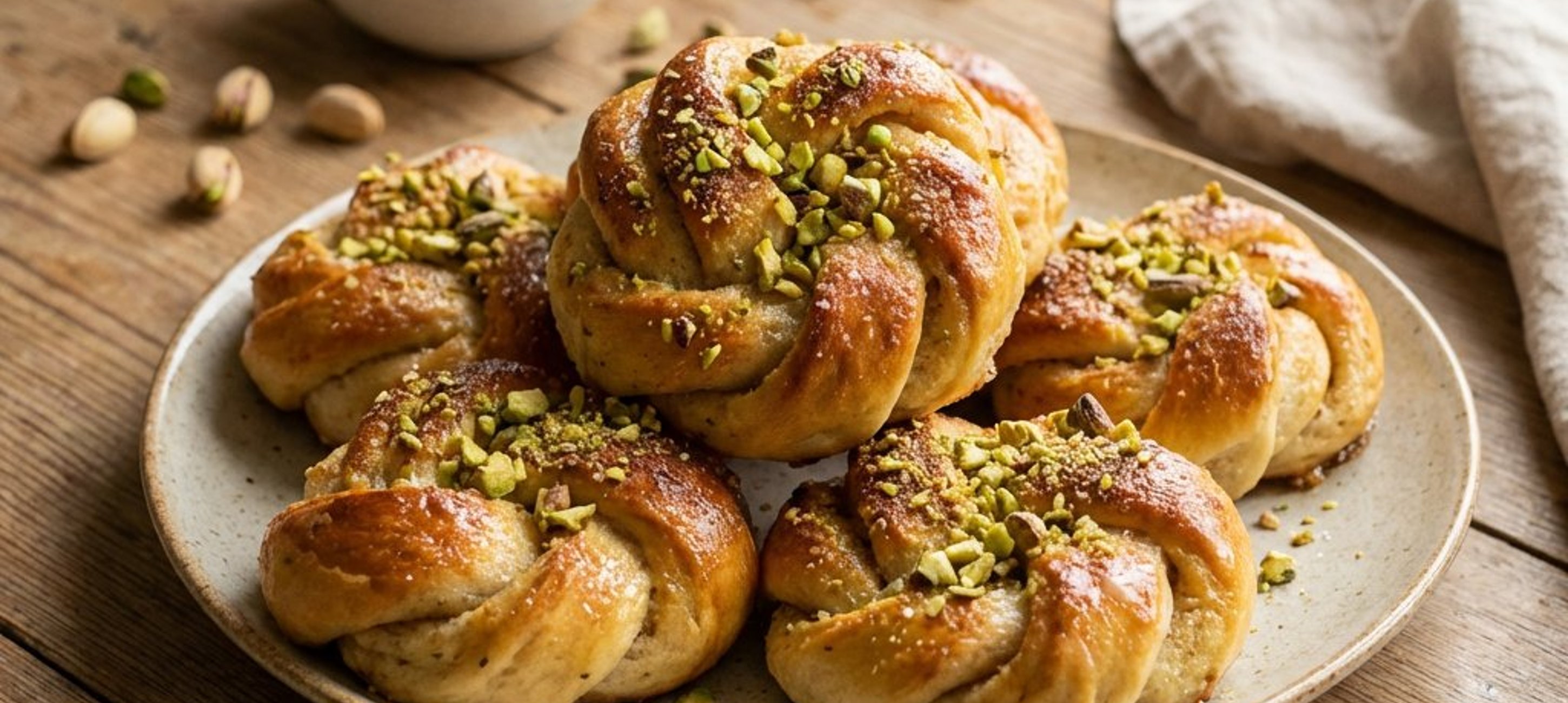 - 3Preîncălziți cuptorul la 170 °C (funcția cu ventilație). Ungeți nodurile cu cel de-al doilea ou bătut și presărați fisticul tocat deasupra. Coaceți timp de 20 de minute până devin aurii.