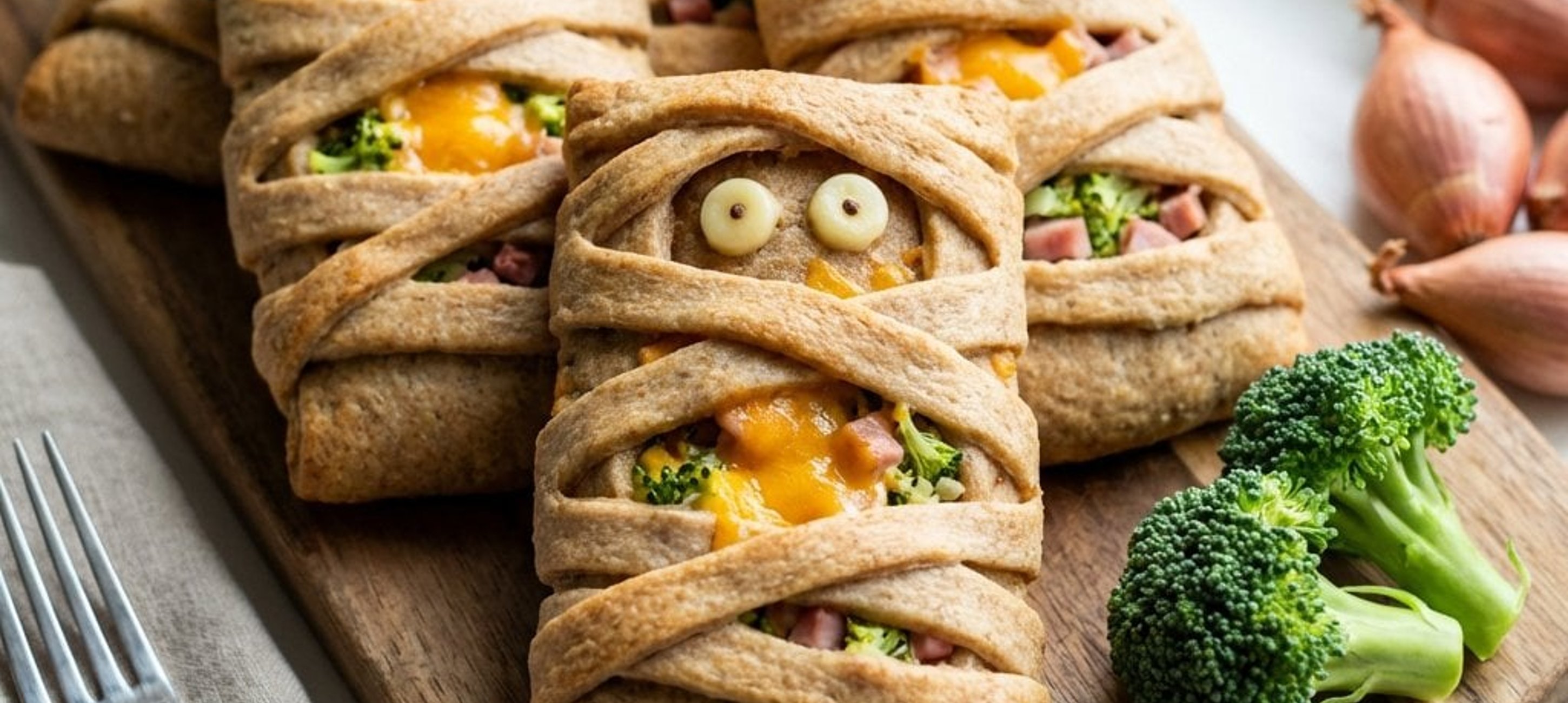 - 4Întindeți aluatul într-o foaie de 2-3 mm grosime, de aproximativ 50 x 24 cm. Tăiați aluatul în dreptunghiuri de 10 x 12 cm. Așezați umplutura pe o jumătate a fiecărui dreptunghi. Tăiați cealaltă jumătate în fâșii subțiri. Încrucișați fâșiile peste umplutură pentru a crea aspectul de mumie, lăsând un mic spațiu în partea de sus pentru ochi. Sigilați marginile cu o furculiță.