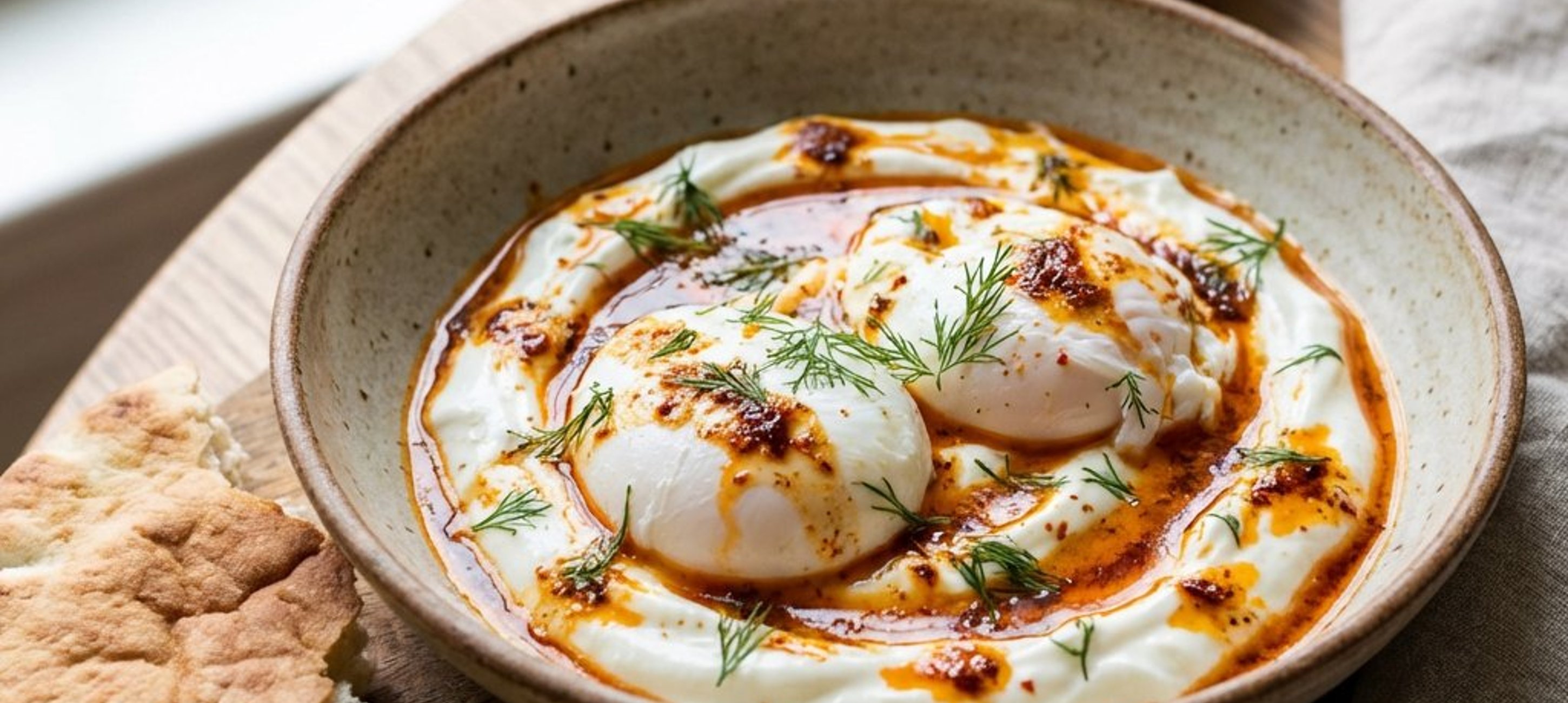 - 3Pentru servire, împărțiți iaurtul aromat în două boluri. Așezați câte două ouă poșate în fiecare bol, turnați deasupra sosul de unt picant și decorați cu puțin mărar proaspăt. Serviți imediat alături de pâinea pita caldă.