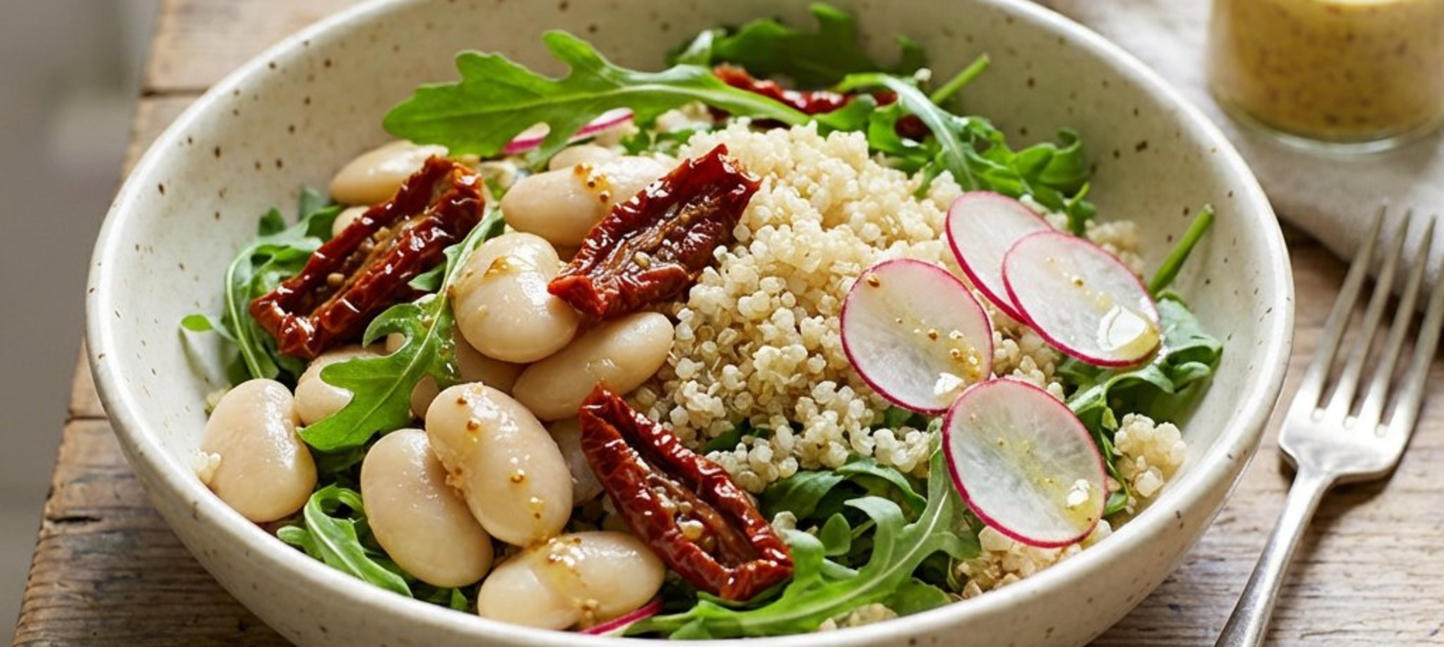 - 1Clătiți fasolea sub jet de apă rece. Tăiați roșiile uscate în bucăți mai mici, iar ridichile în felii subțiri. Spălați rucola. Puneți toate ingredientele, inclusiv quinoa răcită, într-un bol mare.
