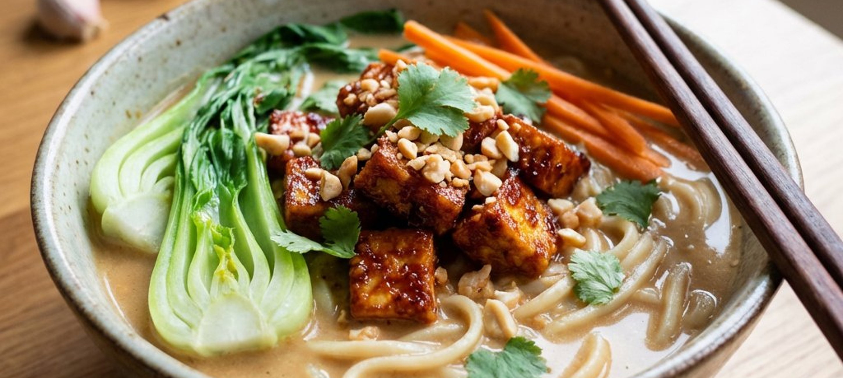 - 4Fierbe tăiețeii ramen conform instrucțiunilor de pe ambalaj. Scurge apa și servește imediat: pune tăiețeii în boluri, toarnă supa fierbinte deasupra, adaugă morcovii, pak choi-ul, tofu glazurat, coriandrul proaspăt și presară arahidele tocate. Poftă bună!