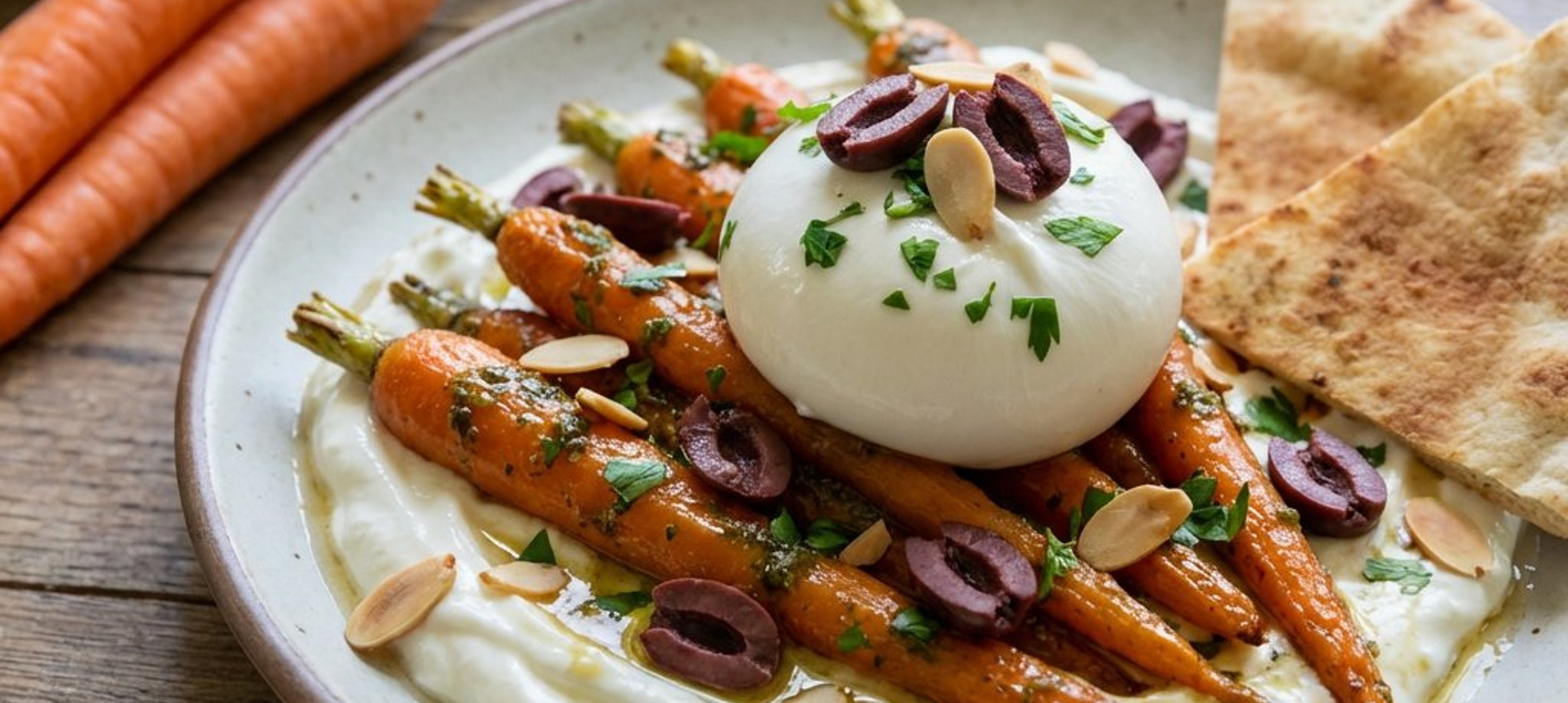 - 3Întindeți iaurtul pe farfurii. Așezați deasupra morcovii copți, apoi presărați măslinele tăiate, pătrunjelul tocat și restul de pesto. Puneți burrata în mijloc și presărați migdalele tocate. Stropiți cu puțin ulei de măsline și serviți cu pâine pita rumenită.