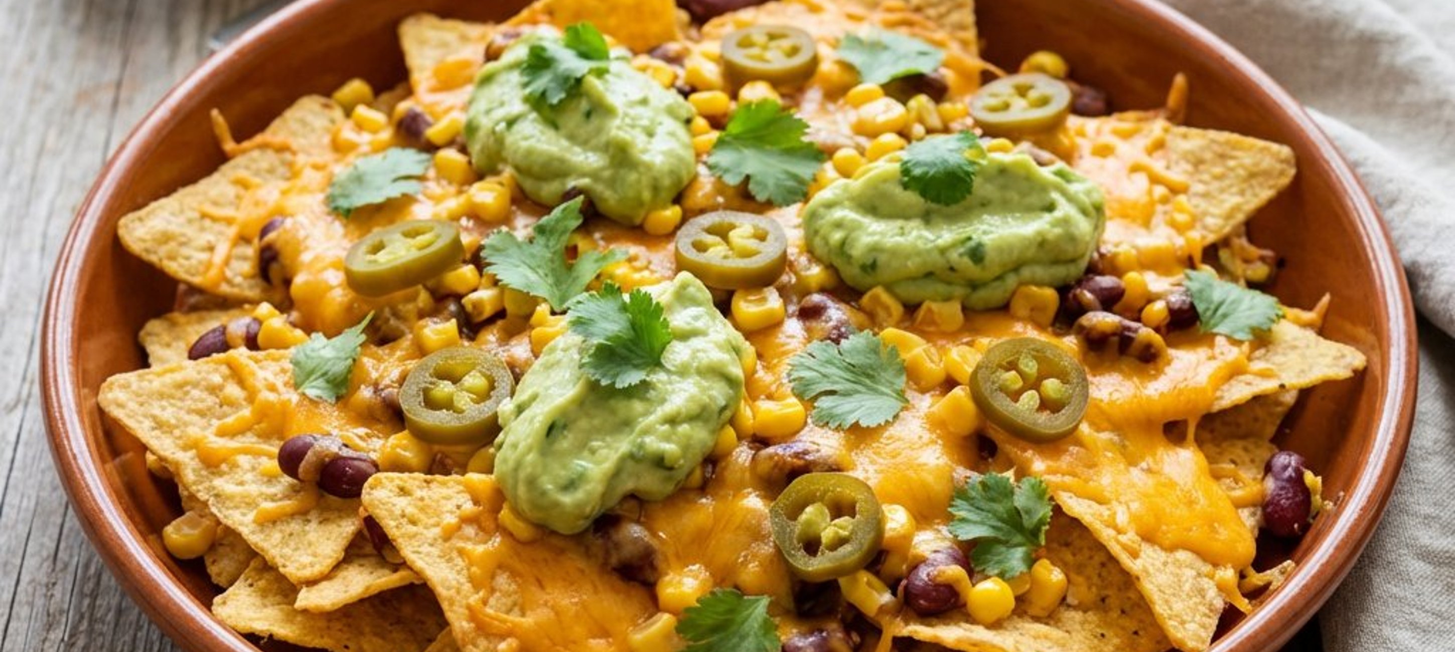 - 4Scoateți tava din cuptor și împărțiți nachos-ul în porții. Peste tortillele calde, radeți fin brânza cheddar, adăugați dip-ul de avocado, porumbul, fasolea scursă, feliile de jalapeño și coriandrul tocat. Serviți imediat.