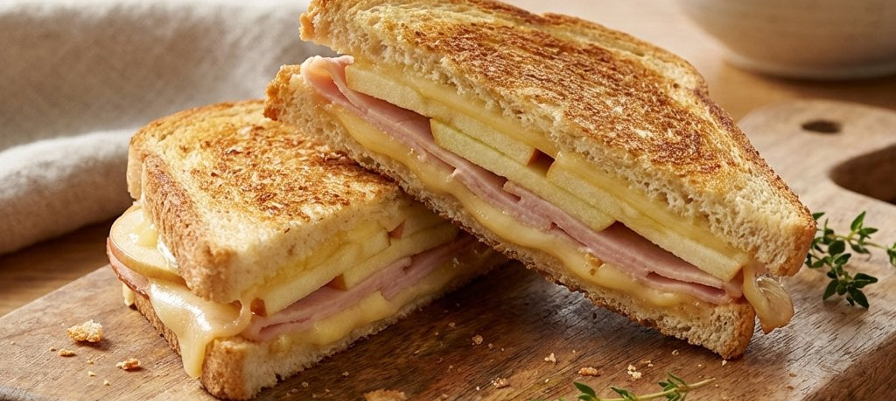 - 2Ungeți o felie de pâine cu muștar de Dijon. Adăugați feliile de șuncă de curcan, feliile subțiri de măr și brânza Gouda, apoi acoperiți cu a doua felie de pâine.