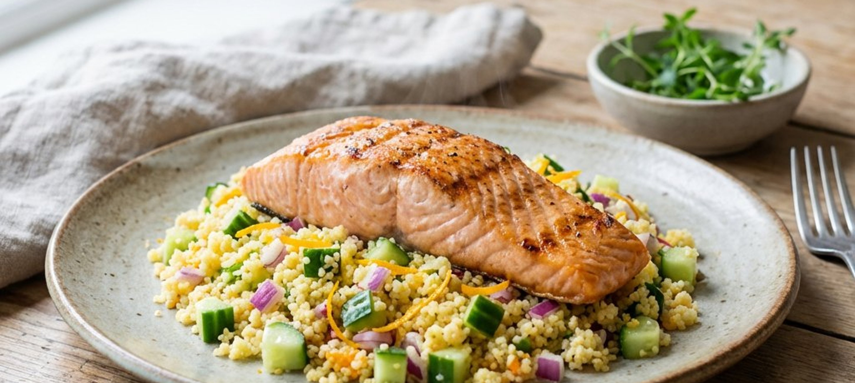 - 3La final, amestecați legumele marinate cu cușcușul hidratat. Serviți salata alături de somonul cald.