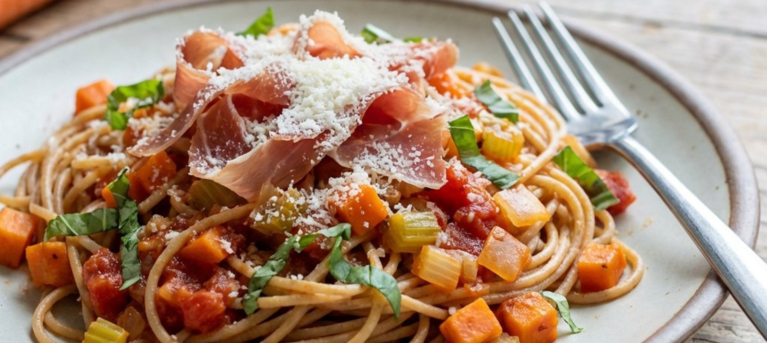 - 1În timp ce pastele fierb, tăiați morcovii, ceapa, țelina și șunca Jamon Serrano în cubulețe mici. Într-o tigaie încăpătoare, încingeți uleiul de măsline la foc mediu. Adăugați legumele și șunca și căliți-le timp de 6–7 minute.