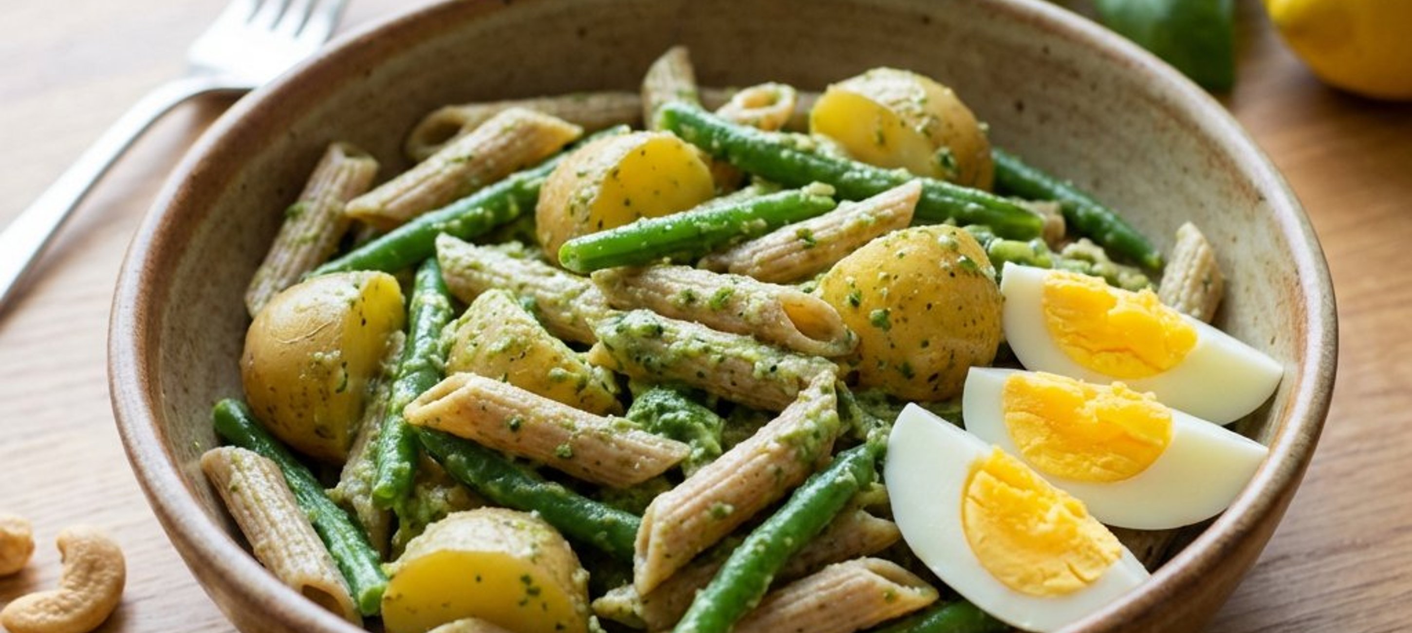 - 2Puneți cartofii, pastele și fasolea verde într-un bol mare și turnați pestoul deasupra. Condimentați cu sare, piper și suc de lămâie după gust, apoi amestecați bine. Serviți salata decorată cu sferturile de ou fiert.