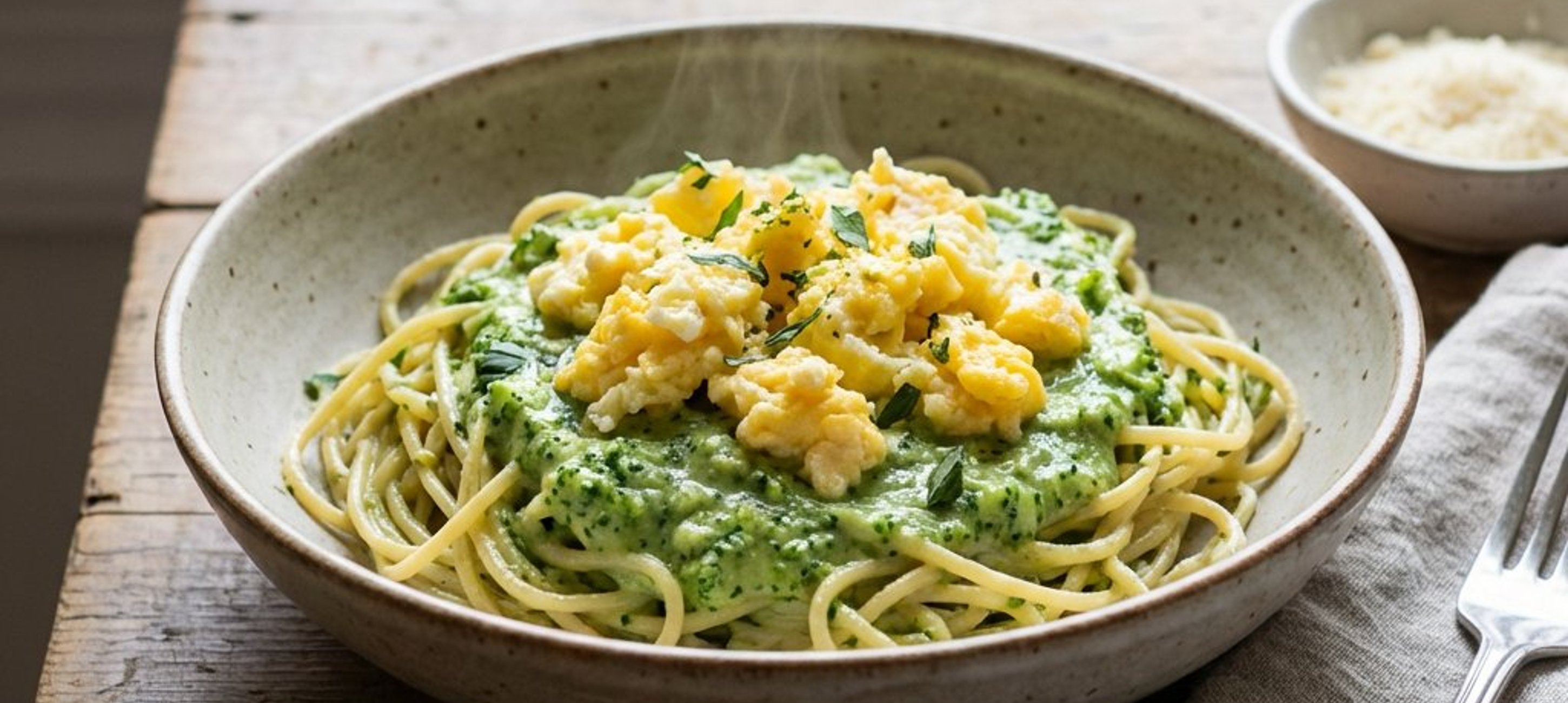 Pentru un plus de aromă, puteți adăuga puțin parmezan ras deasupra la final. Broccoli mixat fin creează o textură catifelată care se lipește perfect de paste.