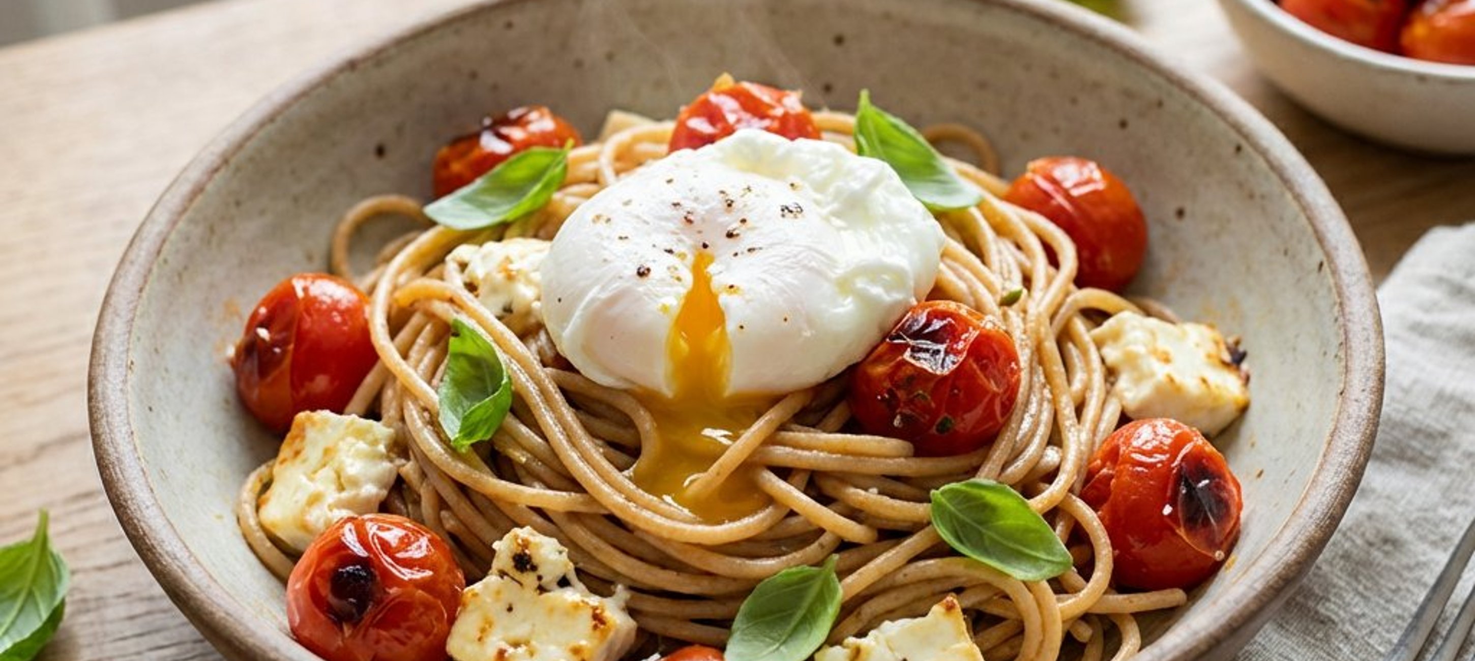 - 2După ce pastele sunt fierte, scurgeți-le și împărțiți-le în 3 boluri. În fiecare bol, adăugați amestecul de feta coaptă cu roșii, amestecați bine și puneți deasupra câte un ou poșat. La final, presărați fiecare porție cu busuioc proaspăt tocat mărunt și serviți imediat.