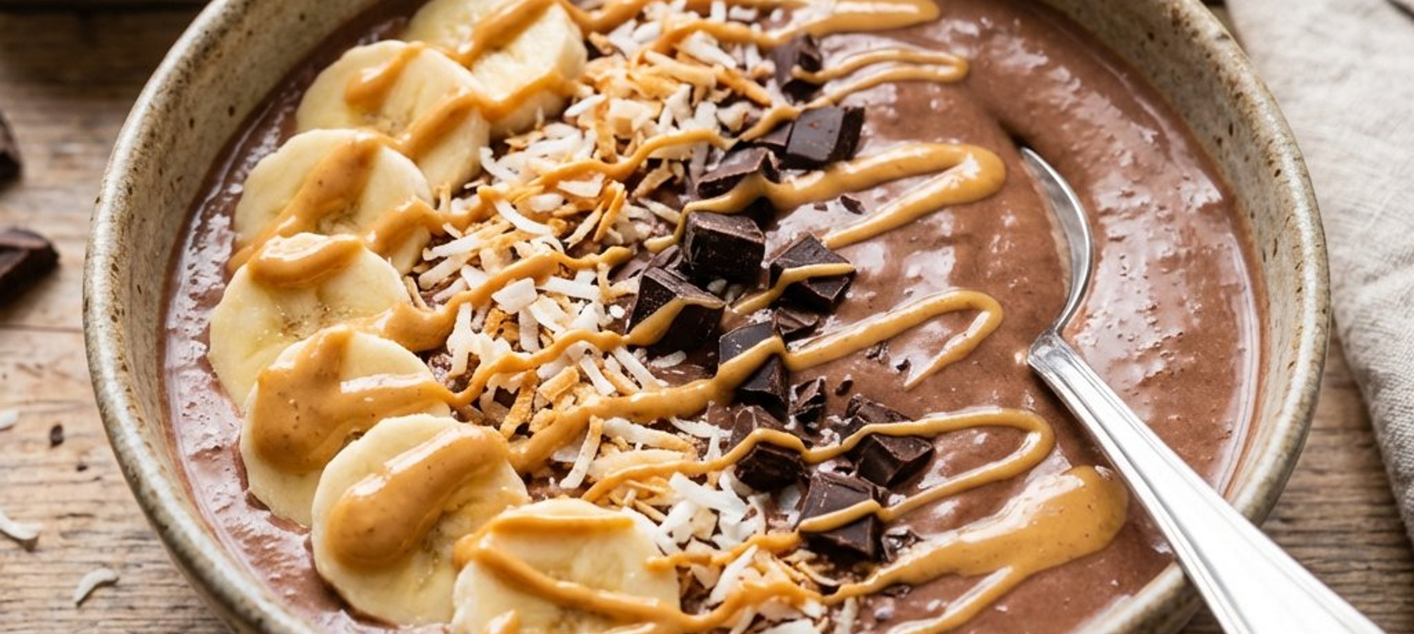 - 1Tăiați banana rămasă în rondele. Decorați smoothie bowl-ul din bol începând cu nuca de cocos răzuită, apoi adăugați ciocolata neagră tăiată mărunt și rondelele de banană. La final, turnați deasupra restul de unt de arahide (1 linguriță). Serviți imediat pentru a vă bucura de prospețime și textură.