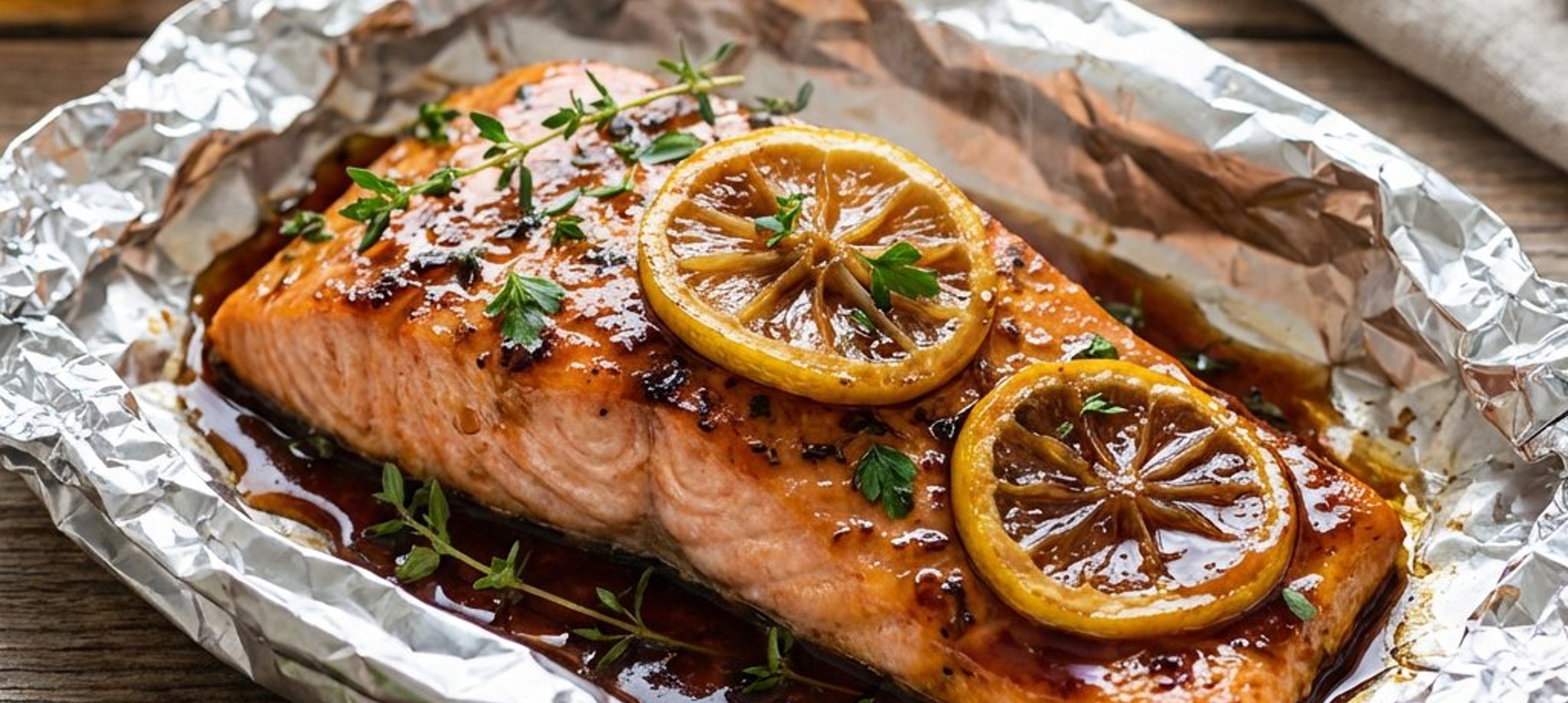 - 4Închideți folia de aluminiu astfel încât să nu existe deschideri, formând un pachet etanș. Coaceți somonul timp de 10–15 minute la 195–200 °C. Apoi, deschideți cu grijă folia (atenție la aburul fierbinte!) și mai coaceți somonul descoperit încă 3–4 minute pentru a se glazura frumos.