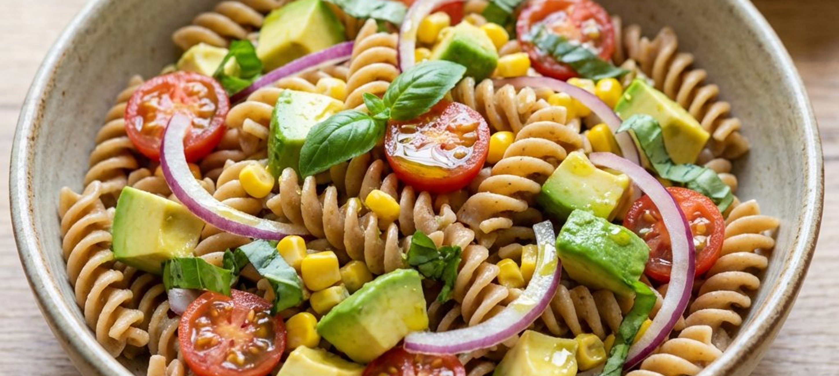 - 3Curățați avocado de coajă, scoateți sâmburele și tăiați-l în cubulețe mici, apoi puneți-le în bolul cu dressing. Curățați ceapa roșie, tăiați-o în felii subțiri și adăugați-o peste avocado. Spălați roșiile cherry, tăiați-le în jumătăți și adăugați-le în bol împreună cu porumbul scurs. La final, rupeți frunzele de busuioc grosier, adăugați pastele fierte și scurse, apoi amestecați totul cu grijă.