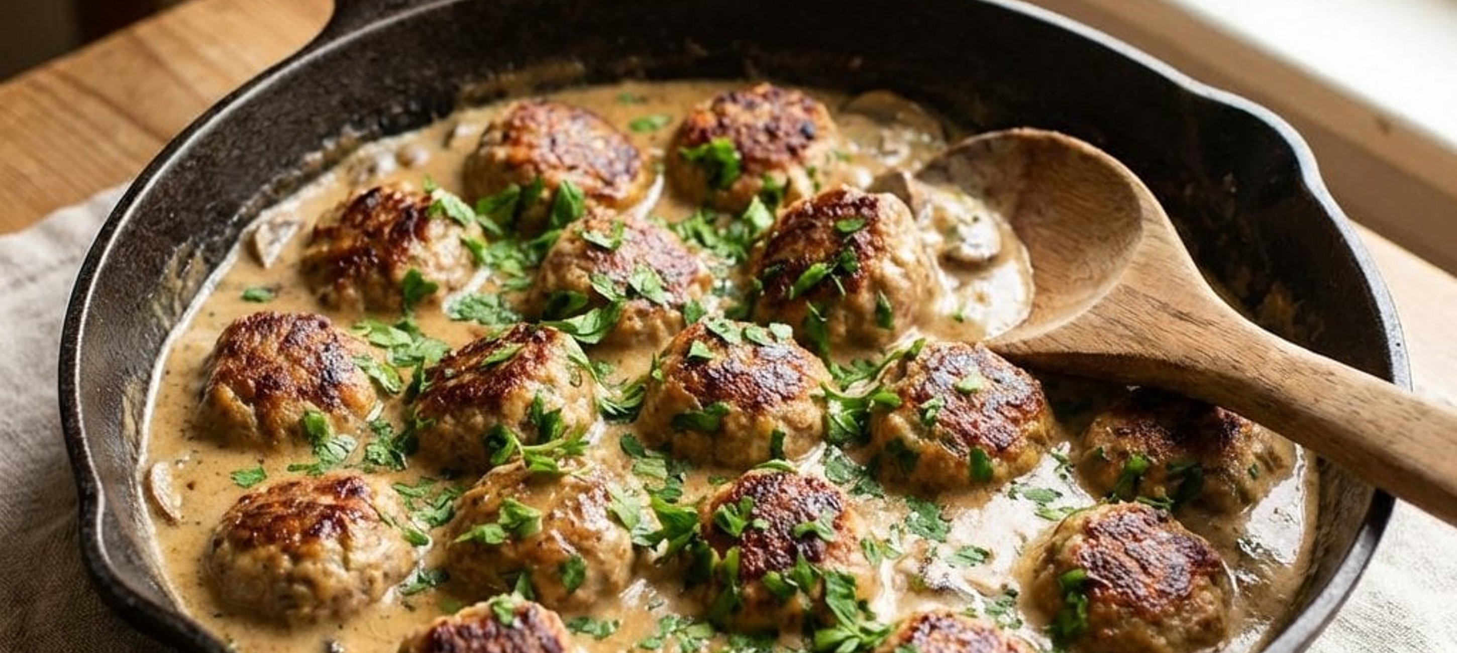 - 2Adăugați smântâna pentru gătit, amestecați bine și puneți chifteluțele înapoi în tigaie. Acoperiți cu un capac și lăsați să fiarbă la foc mic spre mediu timp de 8-10 minute, amestecând ocazional pentru a preveni lipirea sosului.