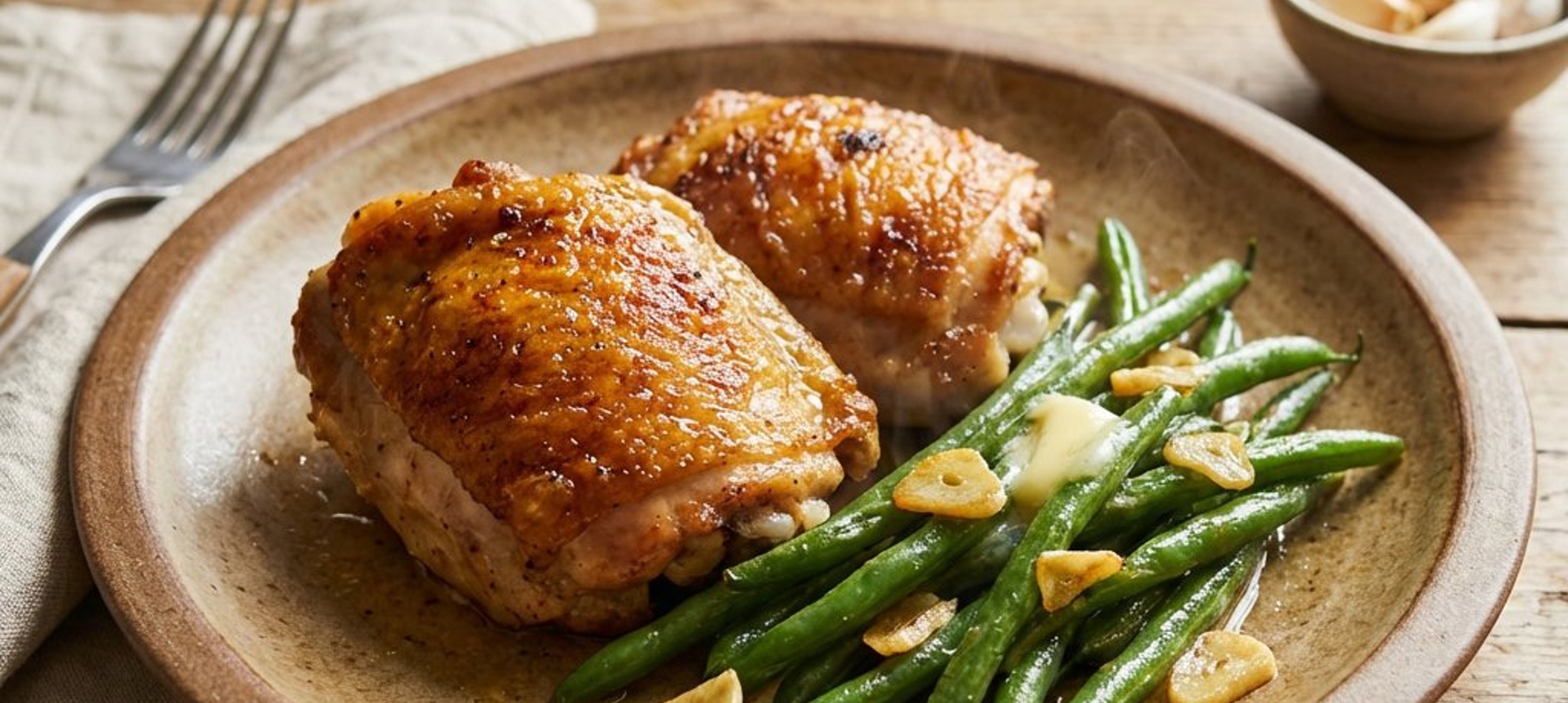 - 2După ce puiul este gata, scoateți-l din tigaie. Reduceți focul la mic, adăugați fasolea verde în aceeași tigaie și sotați-o timp de 3-4 minute. Adăugați untul, usturoiul zdrobit, sarea și piperul și mai gătiți 1-2 minute. Presărați pătrunjelul și fulgii de chilli, amestecând timp de 30-60 de secunde. Reintroduceți puiul în tigaie pentru a-l reîncălzi timp de 1-2 minute. Serviți imediat.