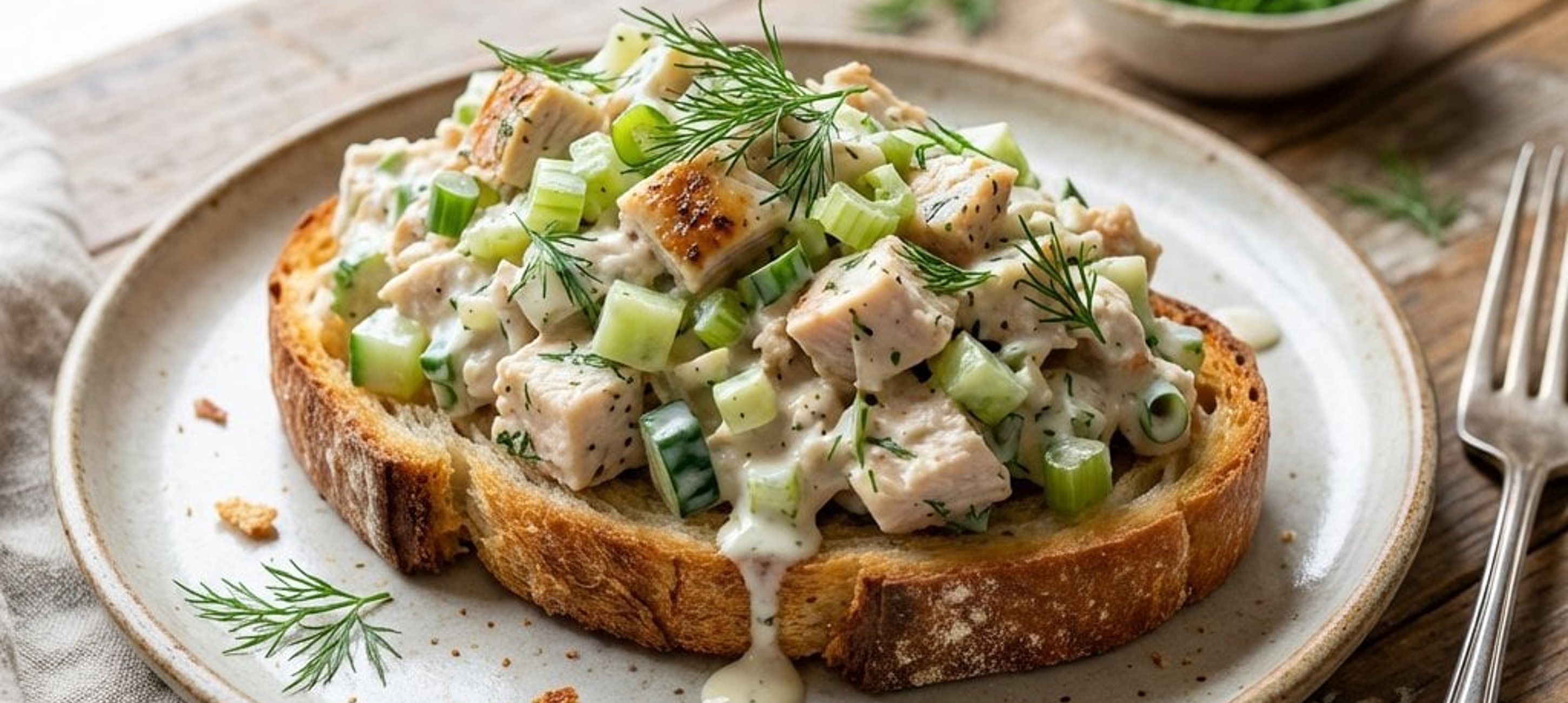 - 3Întindeți salata de pui obținută pe felia de pâine cu maia și serviți imediat. Poftă bună!