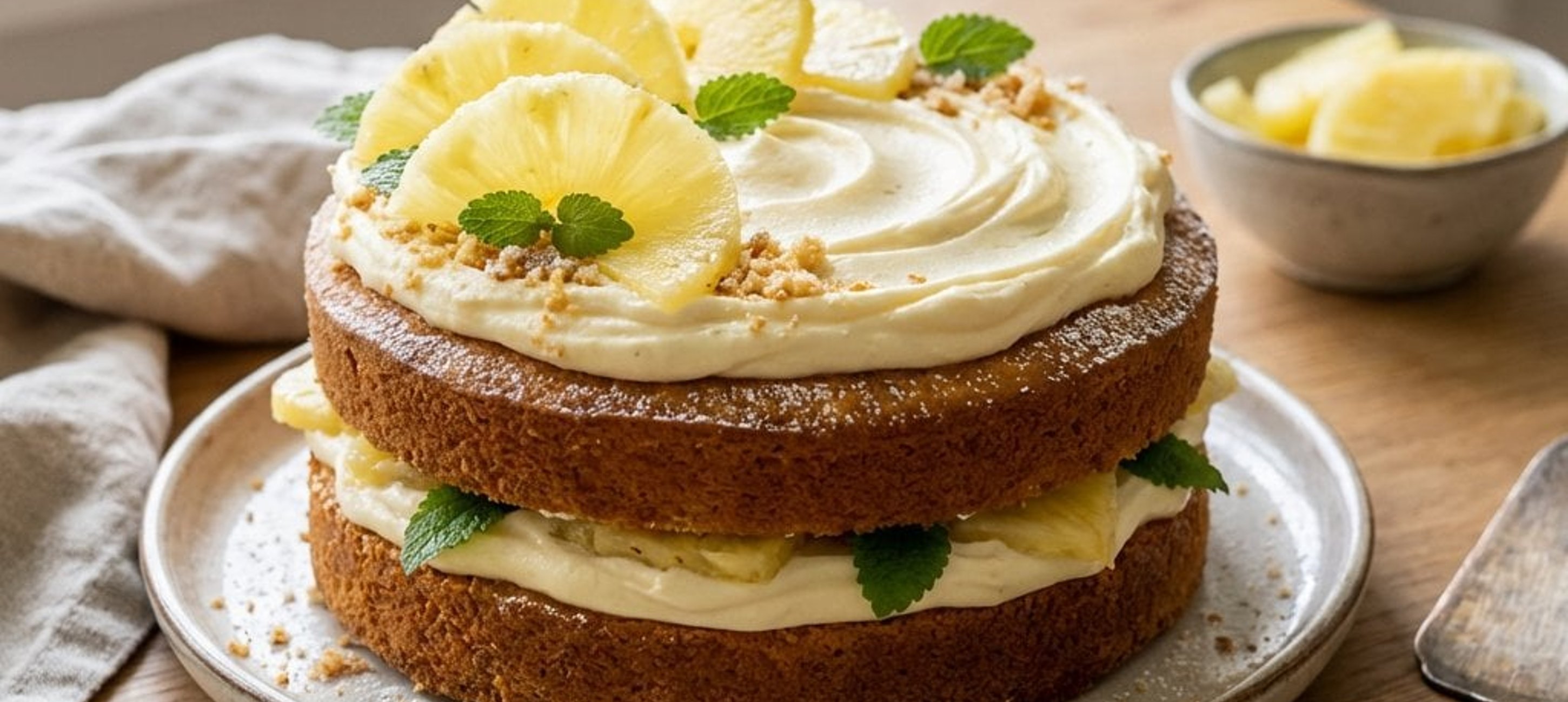 Pentru un aspect deosebit, folosiți o spatulă metalică pentru a nivela crema pe margini, lăsând blatul să se vadă discret. Decorul cu ananas proaspăt adaugă o notă vibrantă și o textură crocantă.