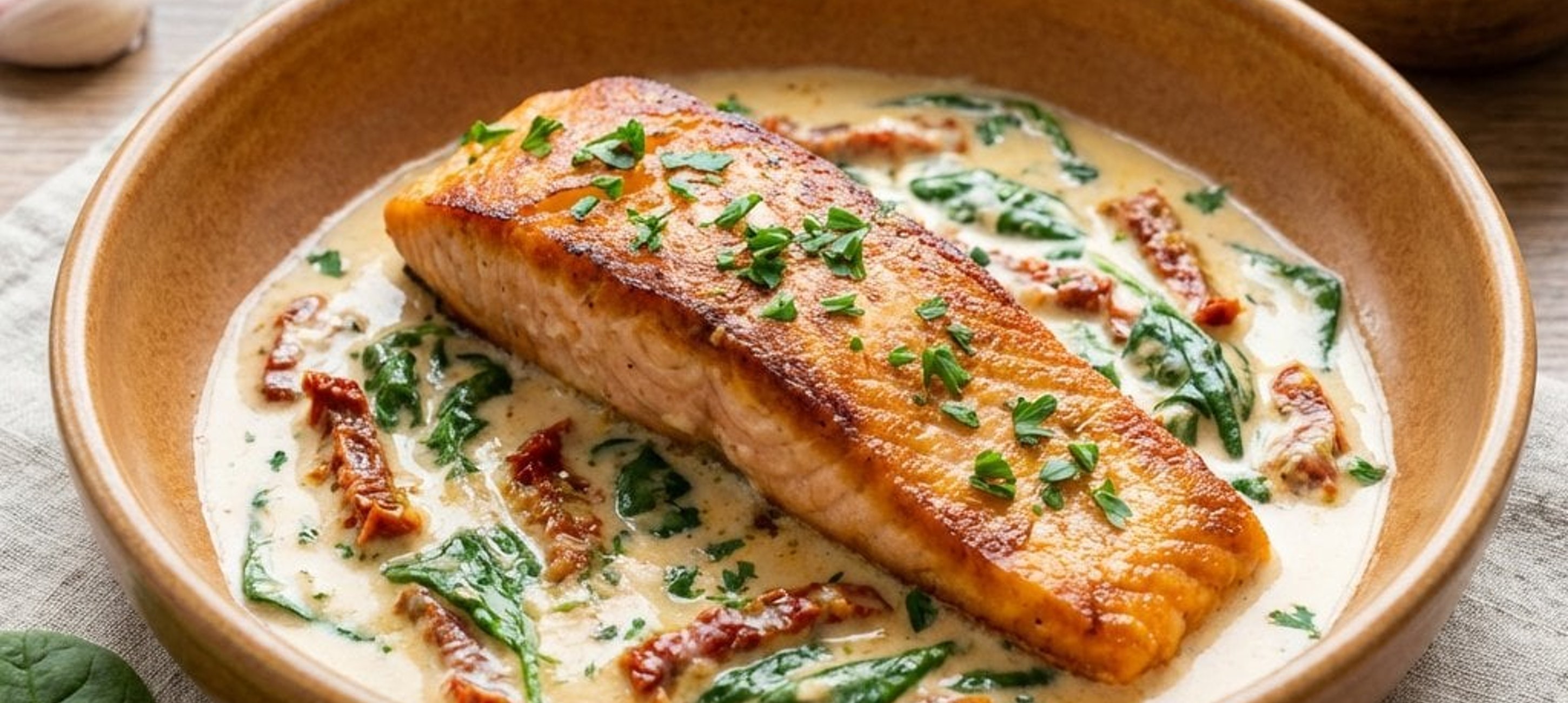 - 1În aceeași tigaie, adaugă untul, ceapa, usturoiul și roșiile uscate. Călește-le 1–2 minute la foc mic. Toarnă laptele de cocos, adaugă parmezanul ras și amestecă bine. Pune somonul înapoi în tigaie și lasă totul să fiarbă 4–5 minute la foc mic. Între timp, toacă mărunt pătrunjelul. La final, încorporează spanacul baby și pătrunjelul, mai gătește 1 minut, apoi ia tigaia de pe foc.