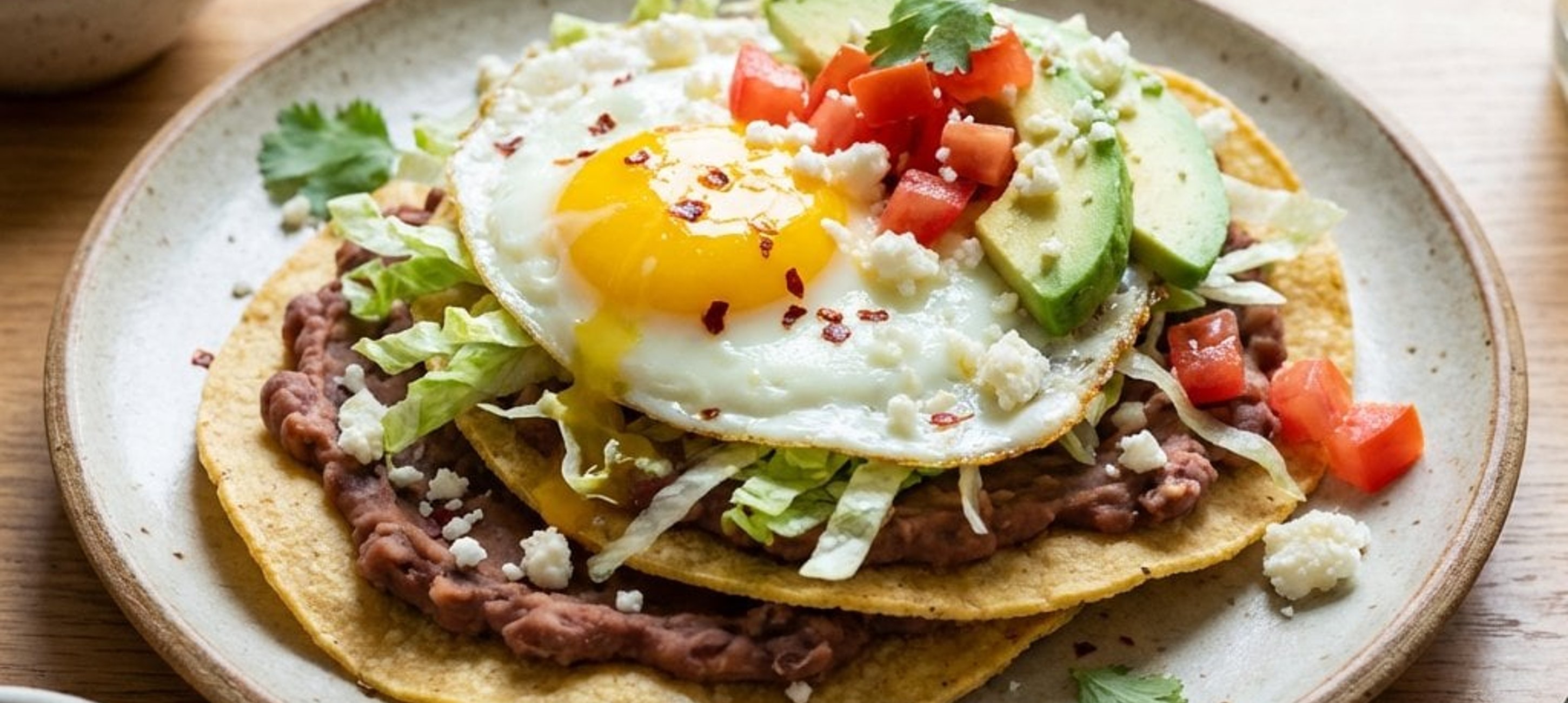 - 1Scurgeți fasolea roșie și împărțiți-o pe fiecare tortilla. Zdrobiți fasolea cu o furculiță și întindeți-o pe toată suprafața tortillei. Distribuiți salata tăiată deasupra, apoi așezați câte un ou pe fiecare tortilla. Adăugați feliile de avocado și amestecul de roșii cu telemea. La final, presărați fulgii de chilli și serviți imediat.