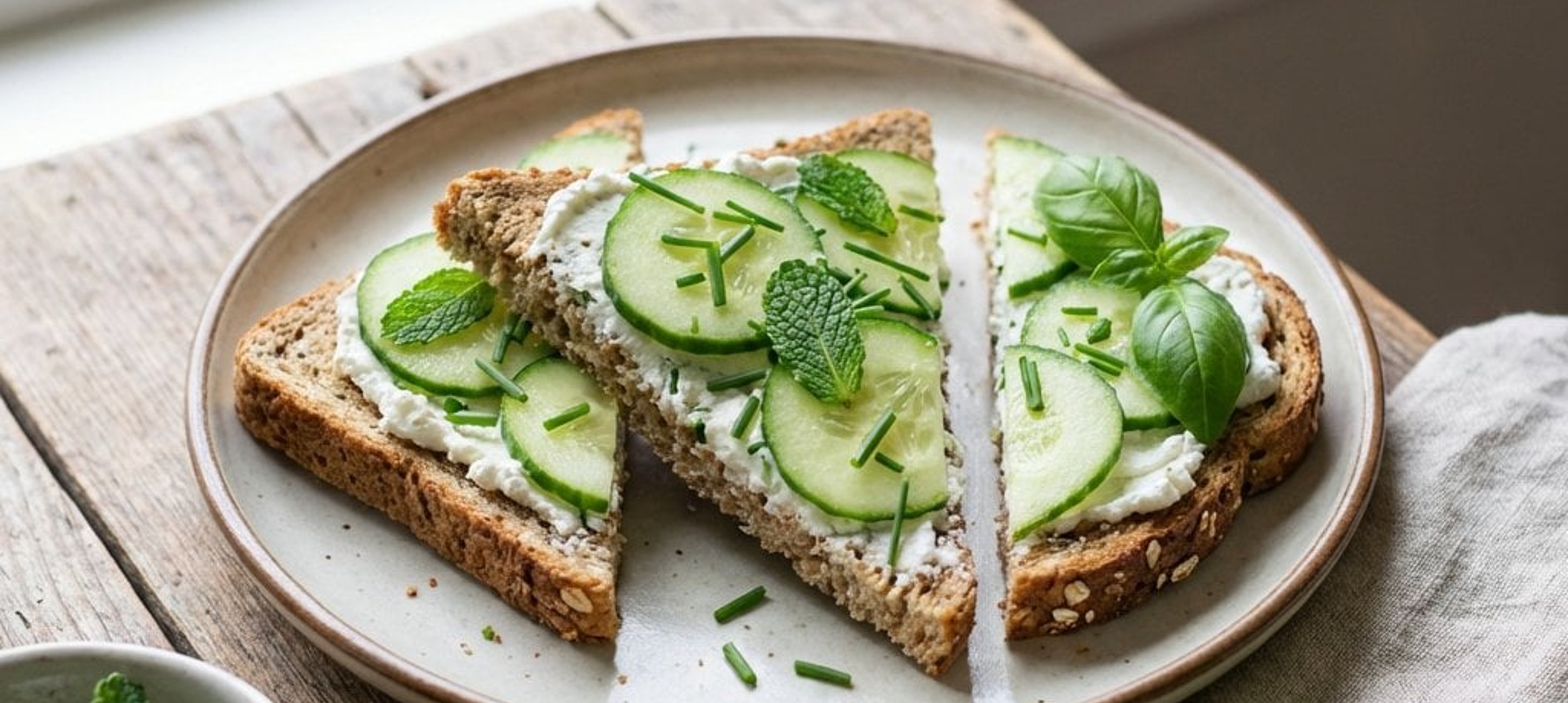 - 3Pregătiți patru felii de pâine toast integrală și întindeți uniform pasta de brânză pe fiecare. Adăugați feliile de castravete și acoperiți cu restul de patru felii de pâine. Tăiați sandvișurile pe diagonală și serviți-le imediat.