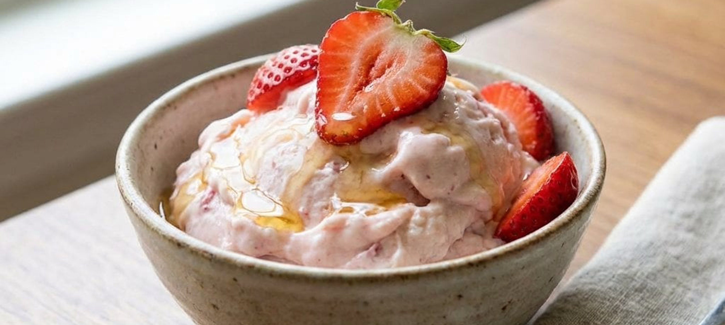 Pentru o textură și mai fină, puteți trece compoziția printr-o sită înainte de a o pune la congelator, pentru a îndepărta semințele mici de căpșuni. Serviți cu câteva felii de căpșuni proaspete deasupra!