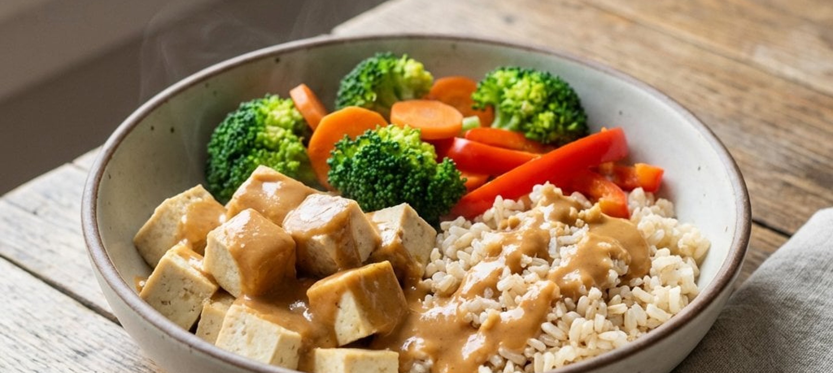 Tofu este o sursă excelentă de proteine vegetale, iar sosul de arahide adaugă o textură cremoasă și un gust bogat acestui preparat asiatic. Pentru un plus de prospețime, nu ezitați să adăugați mai mult coriandru la final!