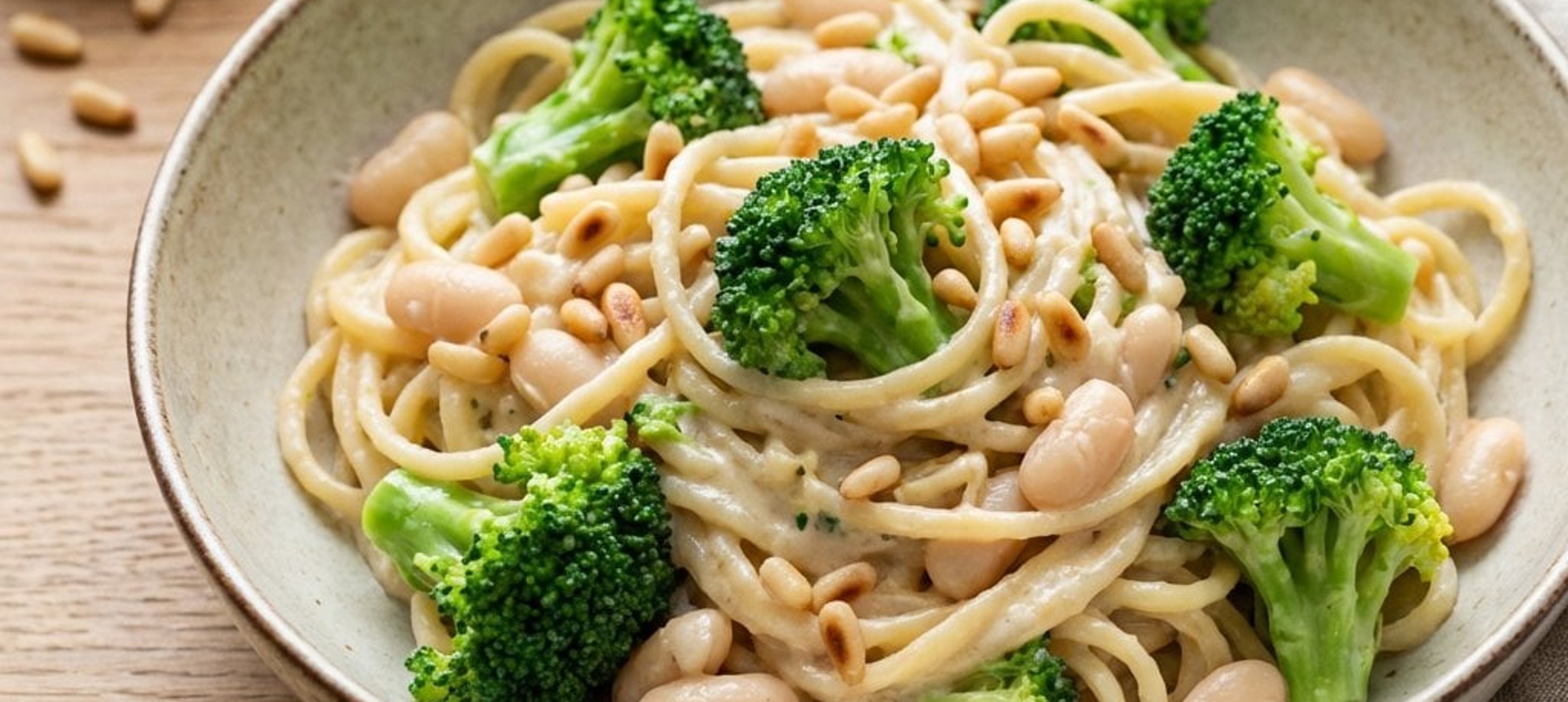- 5Puneți pastele și broccoli înapoi în oală sau într-o tigaie mare. Turnați sosul cremos deasupra, adăugați restul de boabe de fasole întreagă și amestecați bine la foc mic timp de 1-2 minute, până când totul este bine omogenizat și fierbinte. Condimentați cu sare și piper după gust.